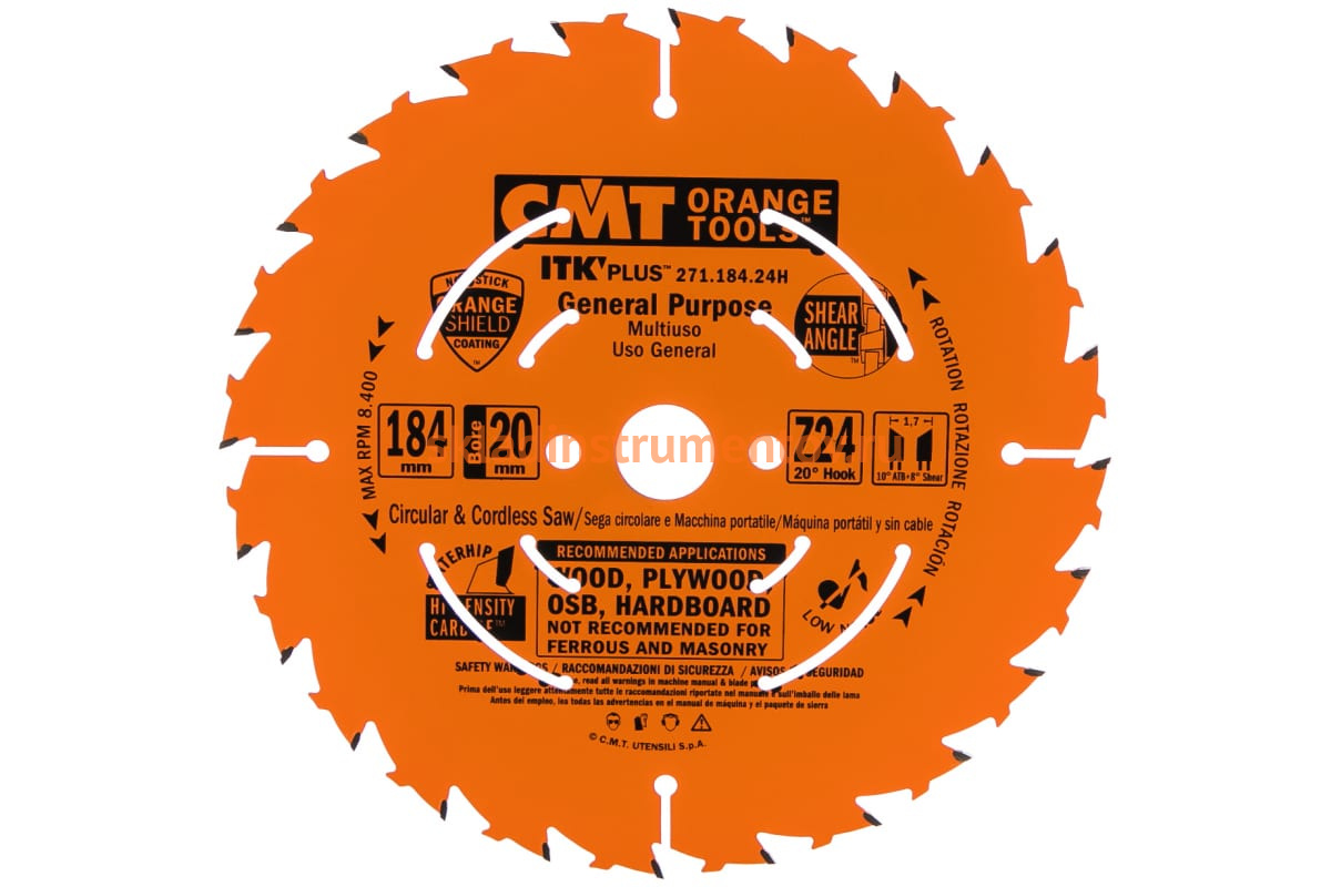 Пильный диск CMT 271.184.24H изготовлен из высококачественной стали и затем закален до значения 44 по шкале твердости Роквелла. Он используется совместно с ручными циркулярными, торцовочными и аккумуляторными пилами. Зубья оснастки выполнены из твердого сплава и имеют специальную форму, благодаря которой снижается нагрузка на пилу и увеличивается скорость пиления. Специальные лазерные прорези на диске способствуют снижению шума и биения, которые вызываются вибрацией пилы во время работы. Антипригарное защитное покрытие пильного диска снижает его перегрев, уменьшает количество налипаемой грязи и защищает от коррозии. Подходит для продольного и поперечного пиления древесины любого вида. Пропил получается очень тонким. В комплект пильного диска с посадочным диаметром 20 мм входят переходные кольца с посадочными диаметрами 16 мм и 15,87 мм.