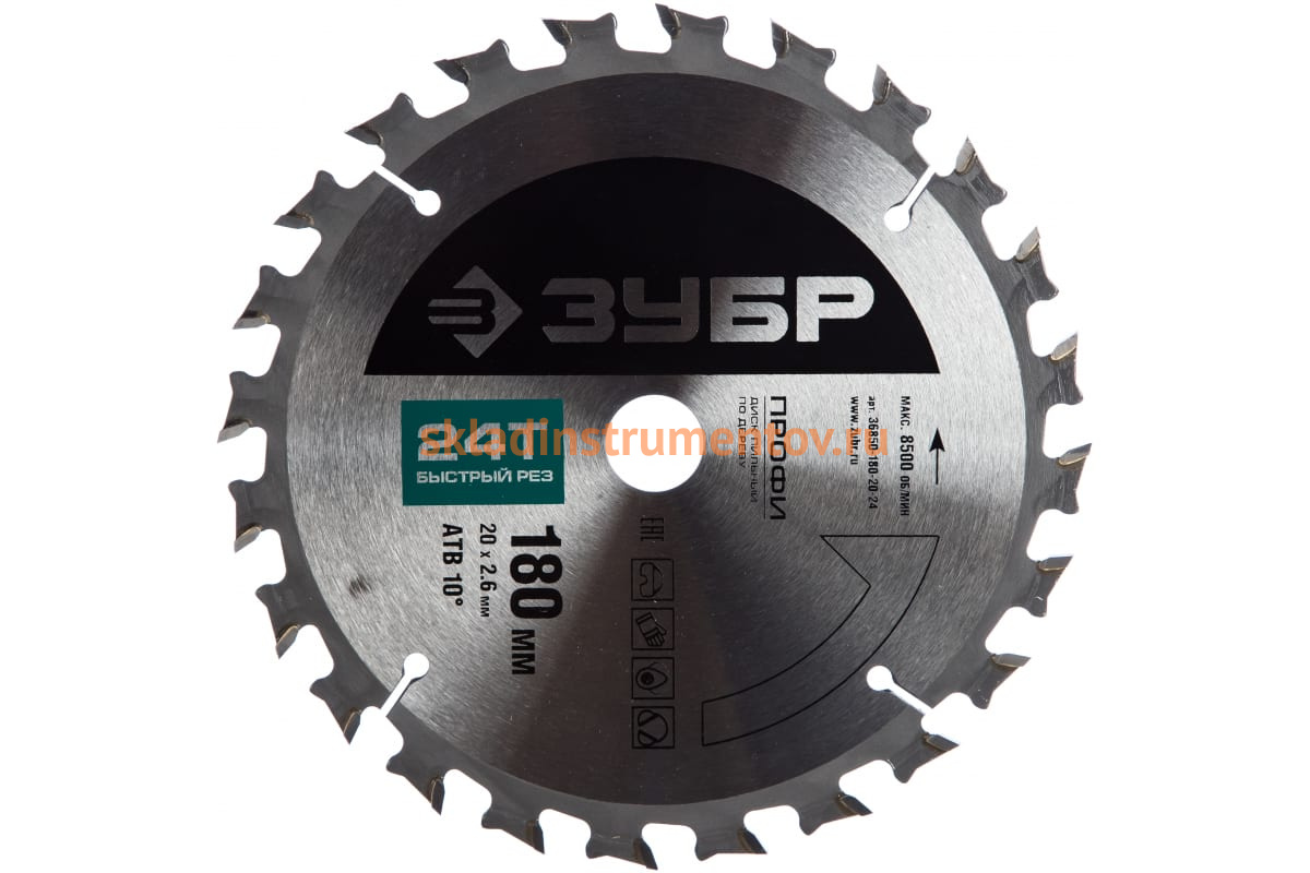 Диск Зубр 36850-180-20-24 является сменным элементом для торцовочных, циркулярных пил и распиловочных станков. Применяется для быстрого, грубого пропила по твердой и мягкой древесине, обшивочным и необработанным доскам, неламинированному ДСП, строительному брусу. Зубья изготовлены из улучшенного сплава ВК6Х и ВК8Х. Форма зубьев — ATB. Корпус диска изготовлен из высокоуглеродистой стали 65. Каждый диск проходит алмазную заточку на станках с ЧПУ, закалку с дополнительной стадией термообработки и контроль балансировки.