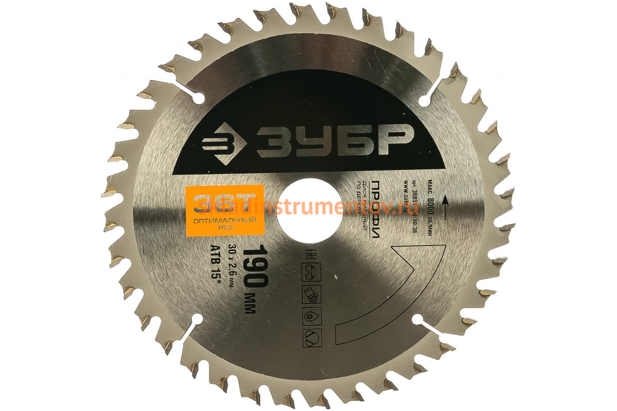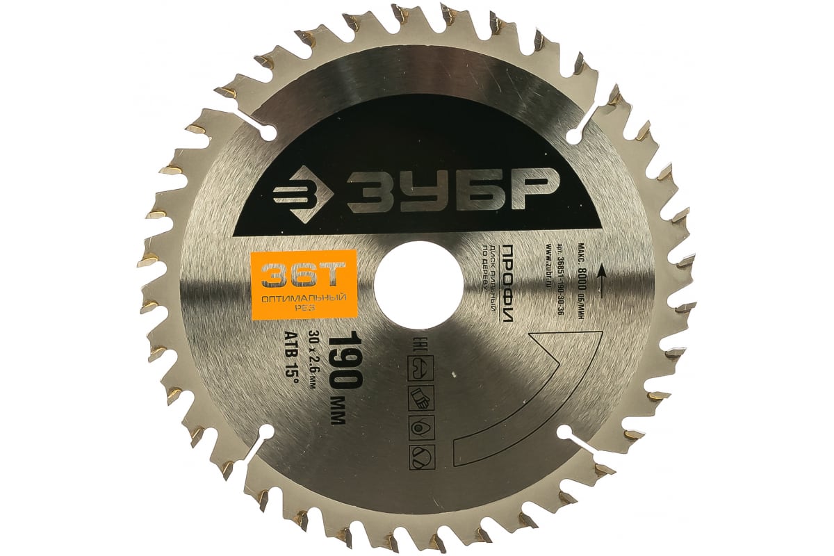 Диск Зубр 36851-190-30-36 является сменным элементом для торцовочных, циркулярных пил и распиловочных станков. Применяется для быстрого, чистого пропила по твердой и мягкой древесине, фанере, неламинированному ДСП, ДВП и МДФ, волокнистым плитам без покрытия, строительному брусу, деревянным балкам. Зубья изготовлены из улучшенного сплава ВК6Х и ВК8Х. Форма зубьев — ATB. Корпус диска изготовлен из высокоуглеродистой стали 65. Каждый диск проходит алмазную заточку на станках с ЧПУ, закалку с дополнительной стадией термообработки и контроль балансировки.
