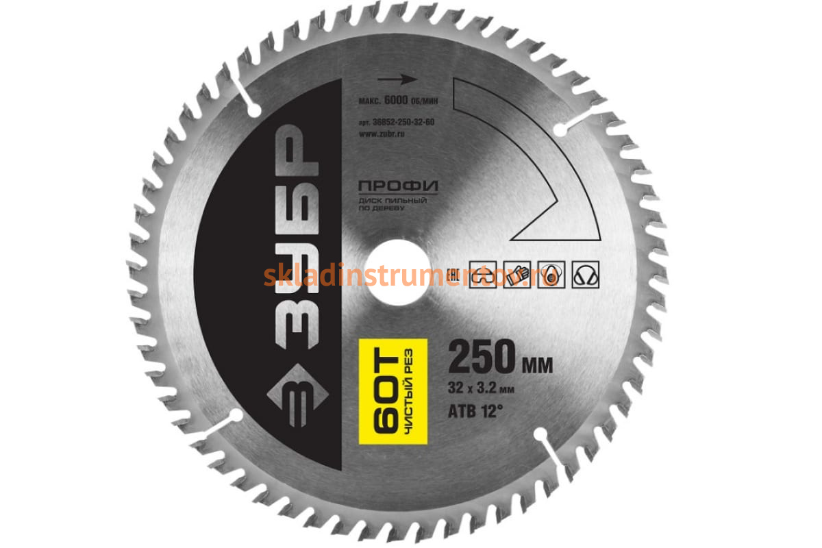Диск Зубр 36852-250-32-60 является сменным элементом для торцовочных, циркулярных пил и распиловочных станков. Применяется для точного, особо чистого пропила по фанере, столярным плитам и щитам, паркетным доскам, прессованной клееной древесине, ламинированному ДСП, МДФ, комбинированным материалам. Зубья изготовлены из улучшенного сплава ВК6Х и ВК8Х. Форма зубьев — ATB. Корпус диска изготовлен из высокоуглеродистой стали 65. Каждый диск проходит алмазную заточку на станках с ЧПУ, закалку с дополнительной стадией термообработки и контроль балансировки.