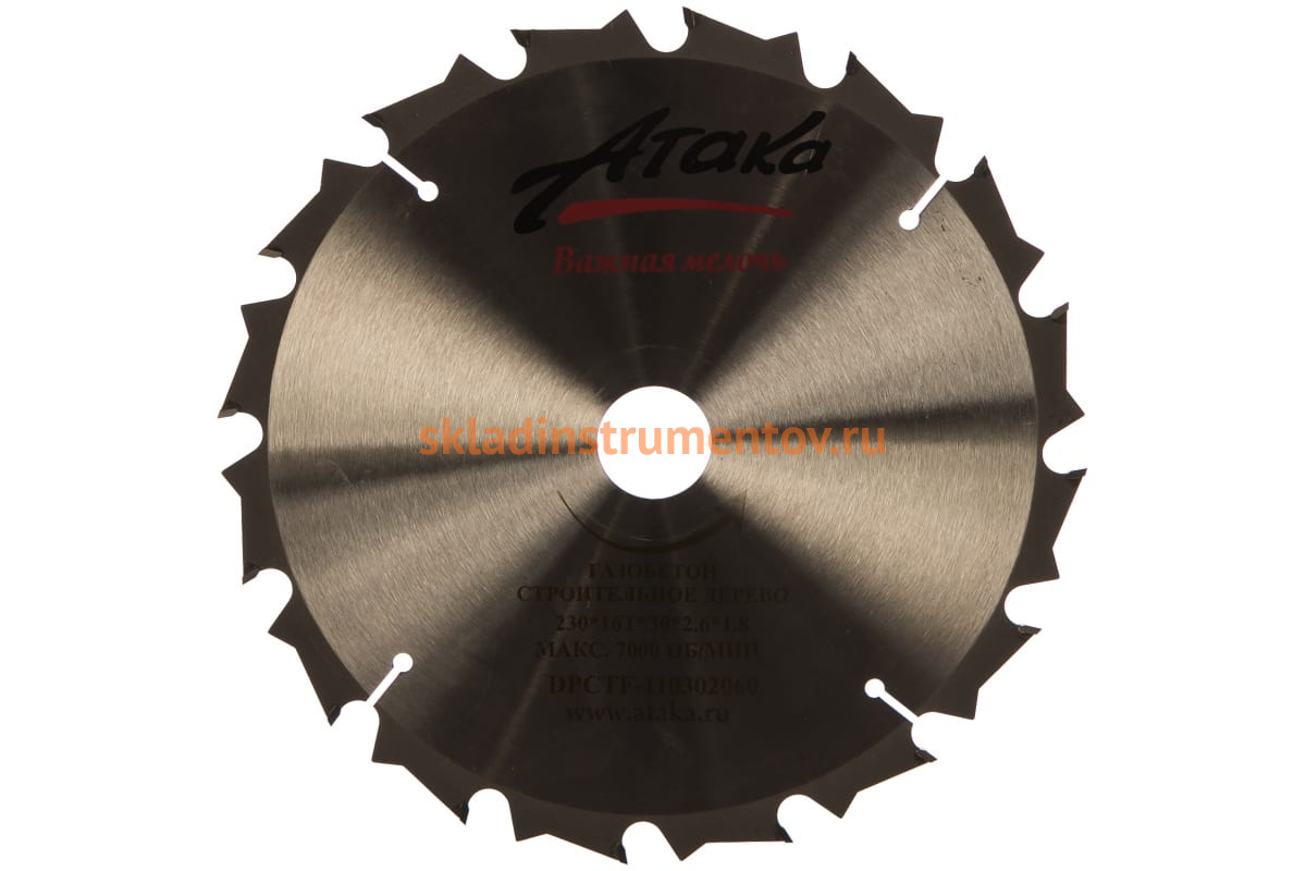 Диск пильный АТАКА 7088910 предназначен для циркулярных пил. Применяется для реза по газобетону и строительному дереву. Специализируется на грубой, первичной распиловке. Оснастка способна преодолевать гвозди, вкрапления волокнистых плит на цементной основе. Диск изготовлен из инструментальной стали, имеет напайки из твердого сплава. Зубья оснащены широкой спинкой, что повышает их ресурс. Тип зубьев – ATB. Компенсационные прорези на теле диска обеспечивают отвод тепла и предотвращают его деформацию. Максимально допустимое количество оборотов – 7000 об/мин.