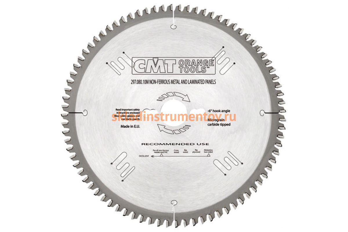 Пильный диск CMT 296.235.48M используется совместно с торцовочными и циркулярными пилами. Зубья оснастки изготовлены из специального сплава и имеют трапецеидальную заточку, что обеспечивает их долговечность и надежность. Благодаря отрицательному углу врезания можно контролировать процесс пиления и оставлять гладкие аккуратные края заготовки без замятия тонких деталей. Диск подходит для отрезных работ по алюминию, меди и другим не содержащим железа металлам, а также по пластику.