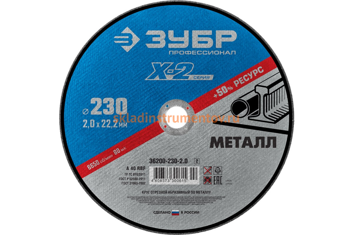 Круг отрезной X-2 Зубр 36200-230-2.0_z03 предназначен для угловых шлифовальных машин и ручных резчиков. Применяется для резки металлических деталей и заготовок, чугунного литья, строительной арматуры и других материалов. Круг оснащен двуслойным армированием полиамидными сетками. Абразивная составляющая - оксид алюминия до 98%. Связующее вещество изготовлено на основе быстросохнущих спиртовых синтетических смол с полным отсутствием содержания серы и хлора.