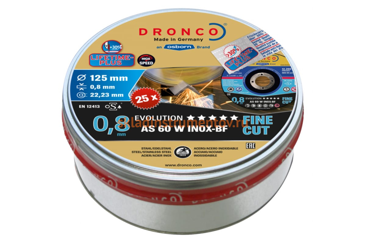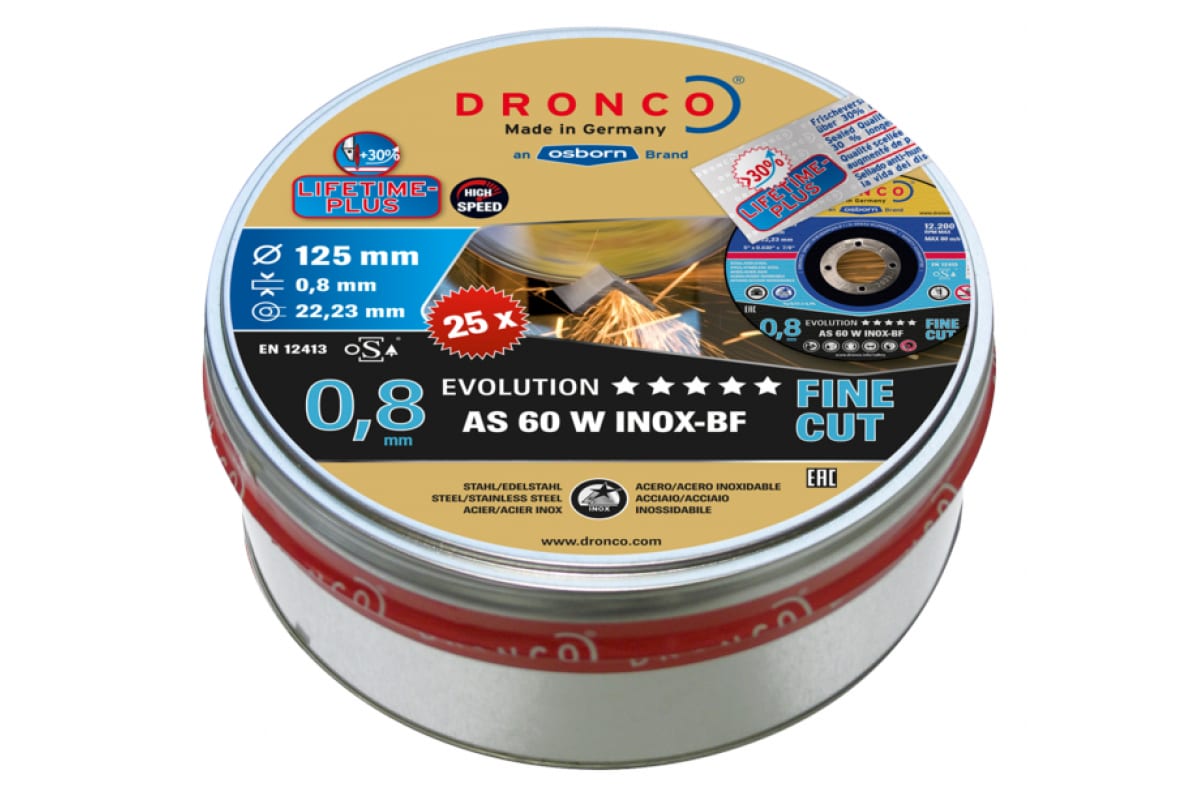 Диск отрезной Evolution AS 60 W BOX-25 DRONCO 6900843100 предназначен для угловых шлифовальных машин и ручных резчиков. Применяется для точной и быстрой резки тонких листовых металлов, стальных тросов, тонкостенных профилей и труб из высокосортной стали, цветных металлов, композитных материалов. Диск обеспечивает рез за минимальное время с минимальным усилием без заусенцев и термического воронения. Поставляется в жестяной коробке.