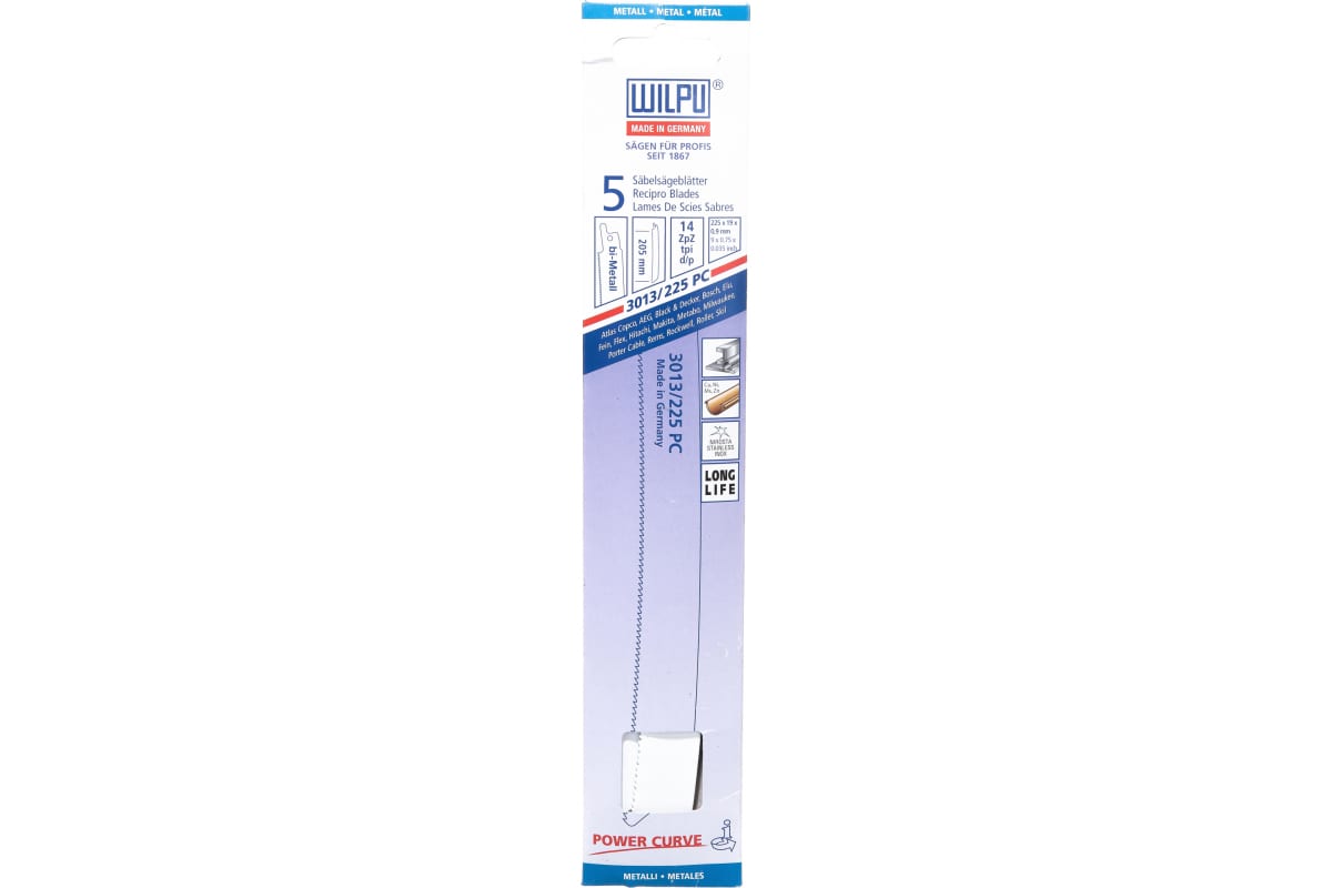 Полотно 3013/225PC WILPU 1472200005 является сменным элементом для сабельной ножовки. Применяется для резки углеродистой и нержавеющей стали от 2 до 8 мм, цветных металлов. Изготовлено из биметалла. Заточка зубьев гарантирует лёгкий и комфортный рез без грубых трещин и сколов. Количество – 5 шт. Шаг 14 TPI.