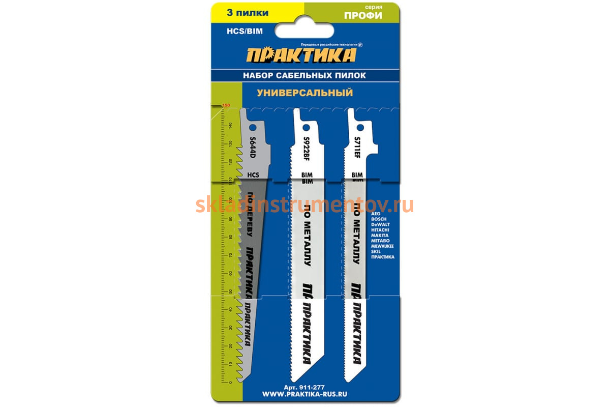 Набор пилок комбинированный S711EF/S922BF/S644D ПРАКТИКА 911-277 предназначен для сабельных пил. Применяется для реза по дереву 10-100 мм и металлу 3-20 мм. В наборе три пилки.