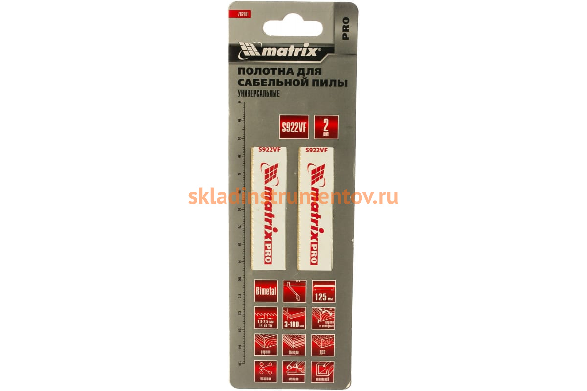 Полотна MATRIX 782001 используются для чистого реза под свободным углом древесины с гвоздями (5-100 мм), листового металла, труб, алюминиевого профиля (3-10 мм), пластмассы и оргстекла (3-100 мм) с помощью сабельной пилы S922VF.