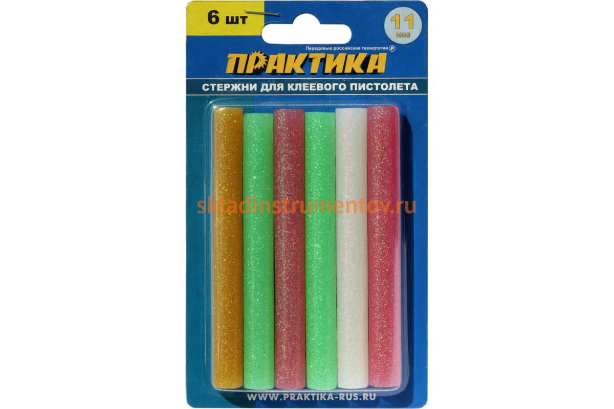 Клей ПРАКТИКА 790-229 предназначен для клеевого пистолета. Является универсальным и применяется для различных материалов: бумага, картон, ткань, войлок, древесина. Используется при изготовлении мебели, а также в домашних мастерских. В наборе 6 разноцветных стержней с блестками.