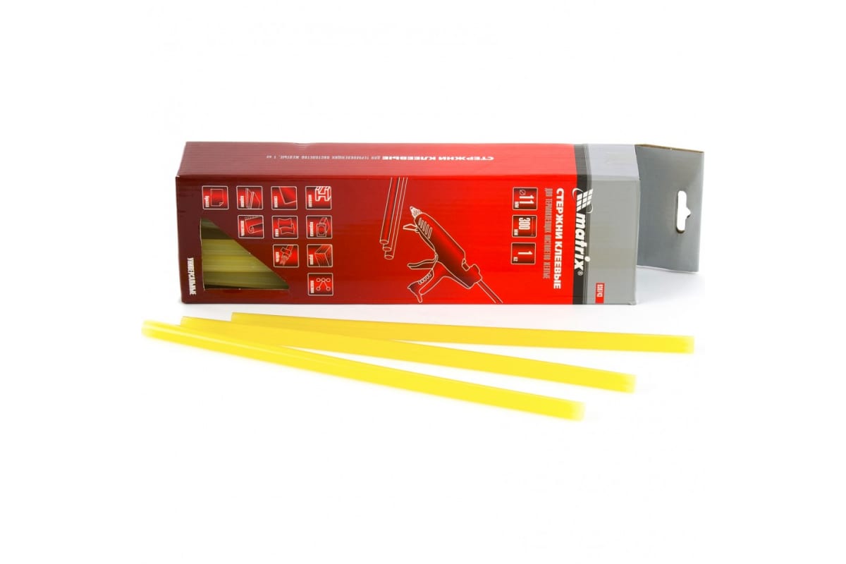 Стержни клеевые MATRIX 930743 используются совместно с клеевыми пистолетами, являются универсальными и применяются для склеивания изделий из дерева, металла, пластика, ткани, кожи, стекла, керамики, бумаги, картона, резины.