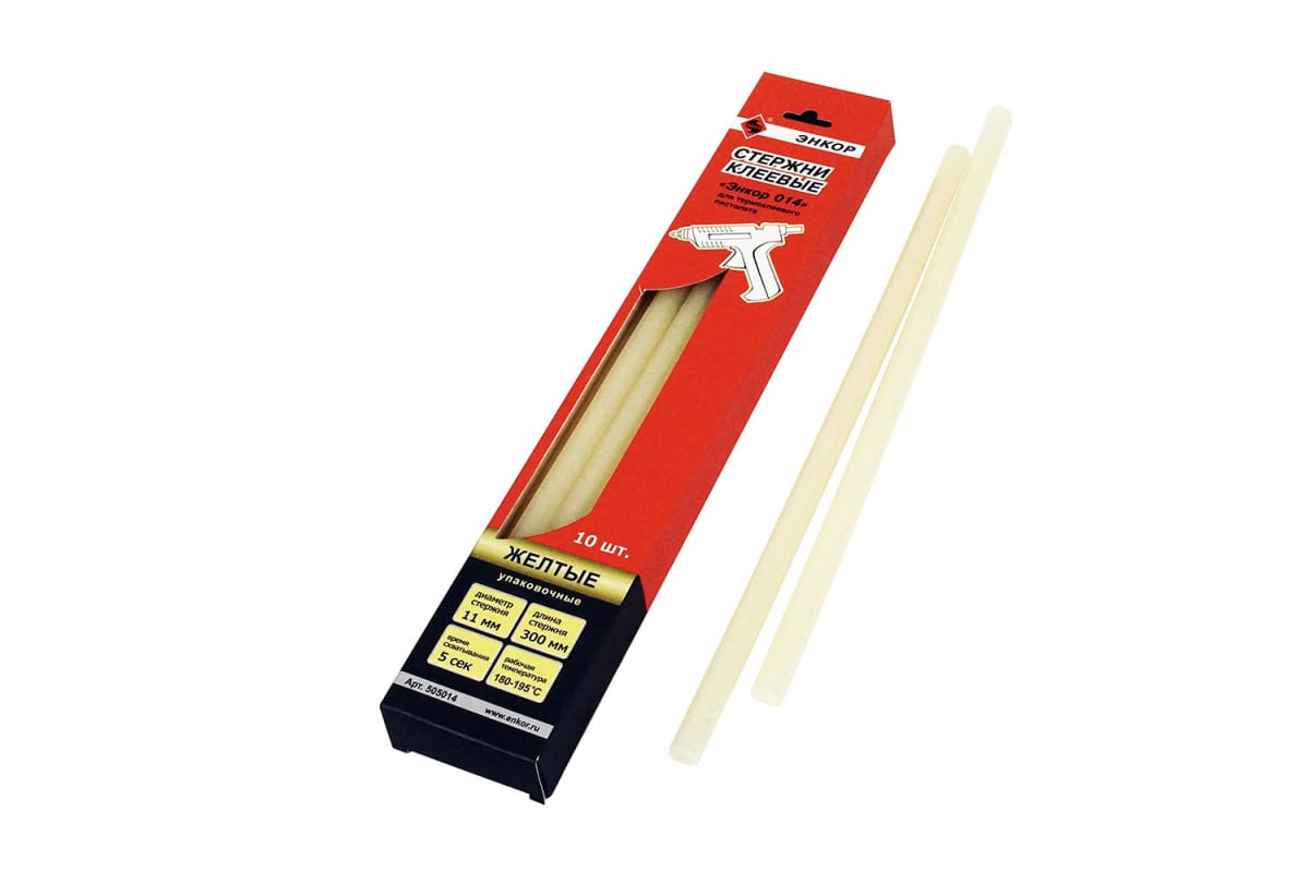 Стержни клеевые Энкор 014 505014 являются универсальными и используются для надежного и безопасного склеивания бумаги, древесины, войлока, стекла и т.д. За 15 секунд схватывают материал и не оставляют следов.