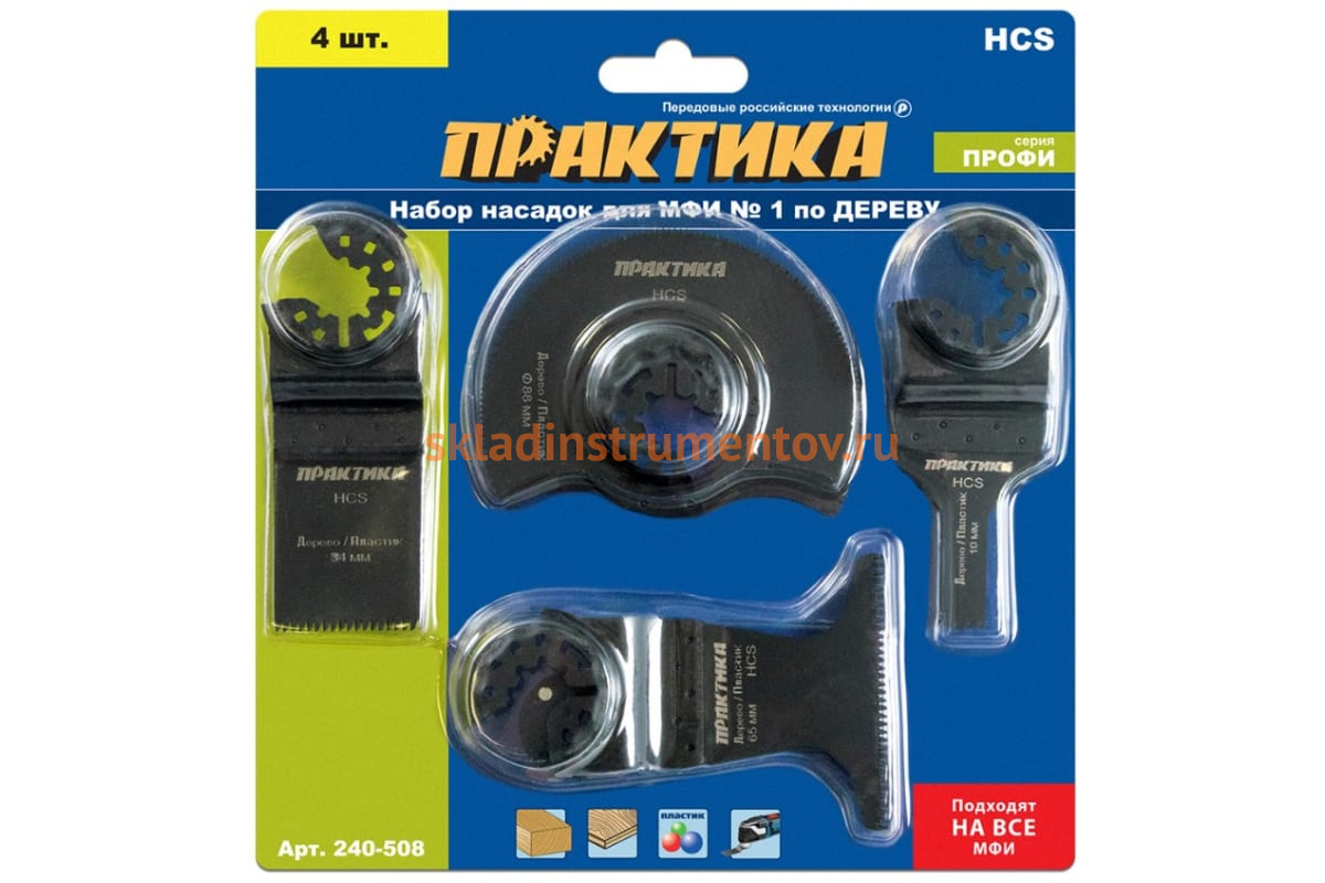 Набор насадок №1 для МФИ по дереву (4 шт.) ПРАКТИКА 240-508 используется совместно с многофункциональным инструментом. Применяется при обработке деревянных изделий, фанеры, пластика, гипсокартона. Набор включает четыре насадки, позволяющие производить различные виды работ: выборка пазов, подрезание внутренних углов, вырезание проемов, резка плинтусов, пластиковых труб и т.д. Насадки изготовлены из высокоуглеродистой инструментальной стали.