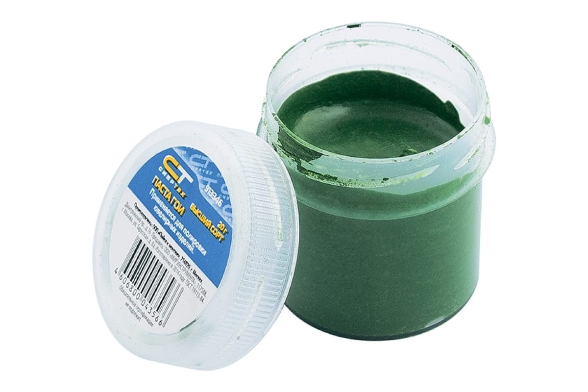 Полировальная паста ГОИ Сибртех 913346 применяется для шлифования и полирования различных материалов. Устраняет мелкие царапины и обеспечивает ровный блеск полируемой поверхности. Состав: оксид хрома, связующие и вспомогательные элементы — керосин, стеарин и др. Масса — 20 гр.
