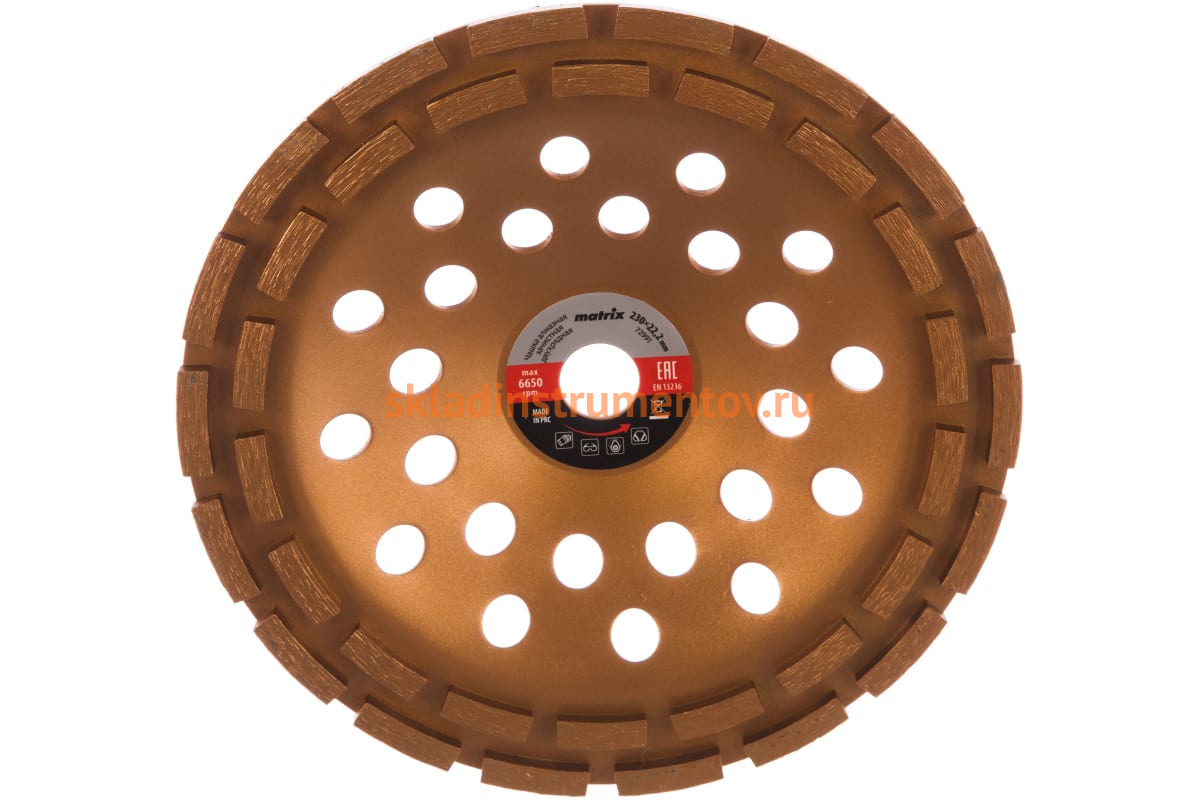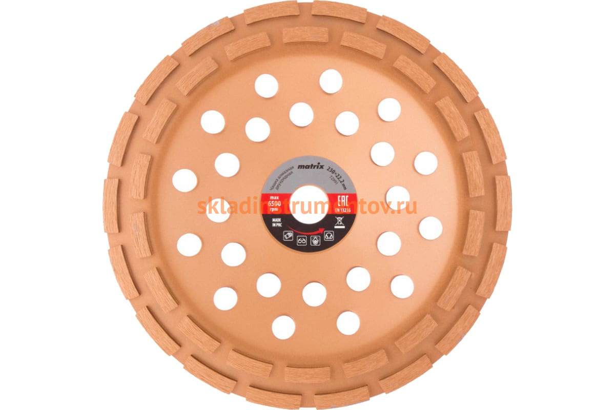 Чашка алмазная зачистная двухрядная MATRIX 72991 предназначена для угловой шлифовальной машины. Применяется для обработки бетона, гранита, мрамора, кирпича, камня. Рекомендуется для интенсивной грубой зачистки, снятия толстых слоев бетона, удаления швов и наплывов после опалубки. Чашка имеет высокий ресурс.