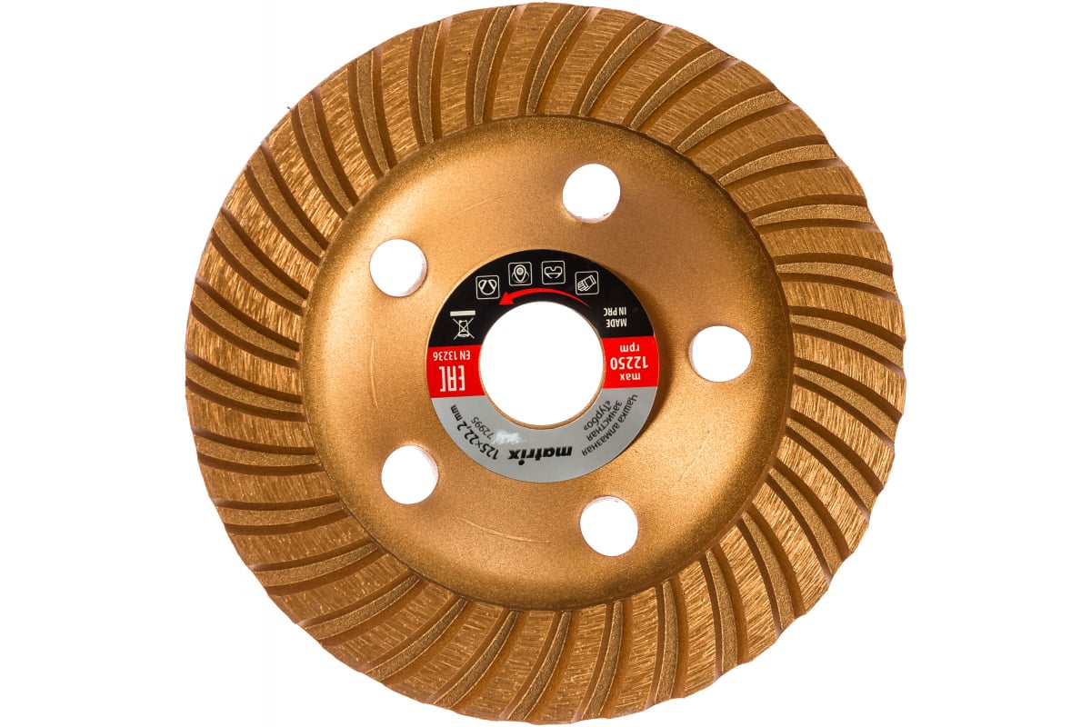 Чашка алмазная зачистная (125 мм) Turbo MATRIX 72995 применяется для шлифования поверхностей из бетона, гранита и мрамора. Рабочая поверхность сегментирована и имеет кромку типа Turbo, что обеспечивает качественное шлифование обрабатываемого материала и не требует дополнительного водного охлаждения.