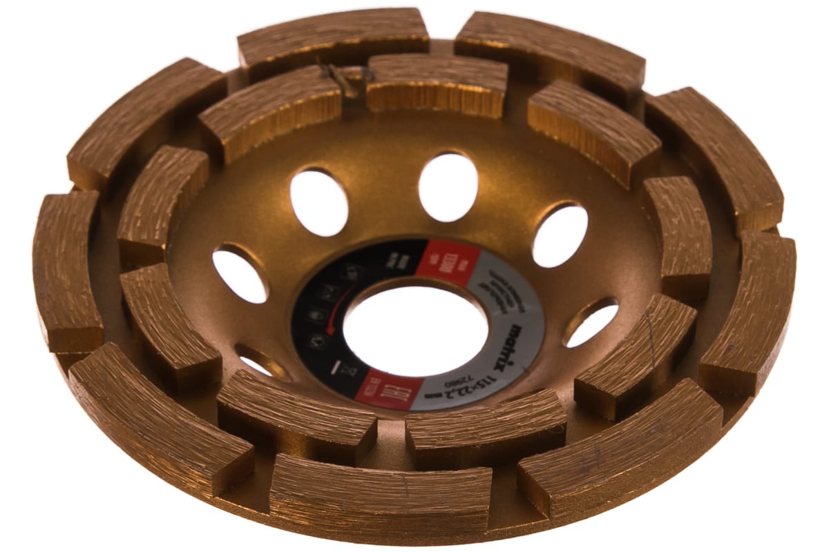 Чашка алмазная зачистная MATRIX 72980 используется совместно с угловыми шлифовальными машинами. Применяется для шлифования поверхностей из бетона, кирпичной кладки, гранита, камня, мрамора. Двойная сегментированная поверхность чашки не требует водяного охлаждения во время работы.