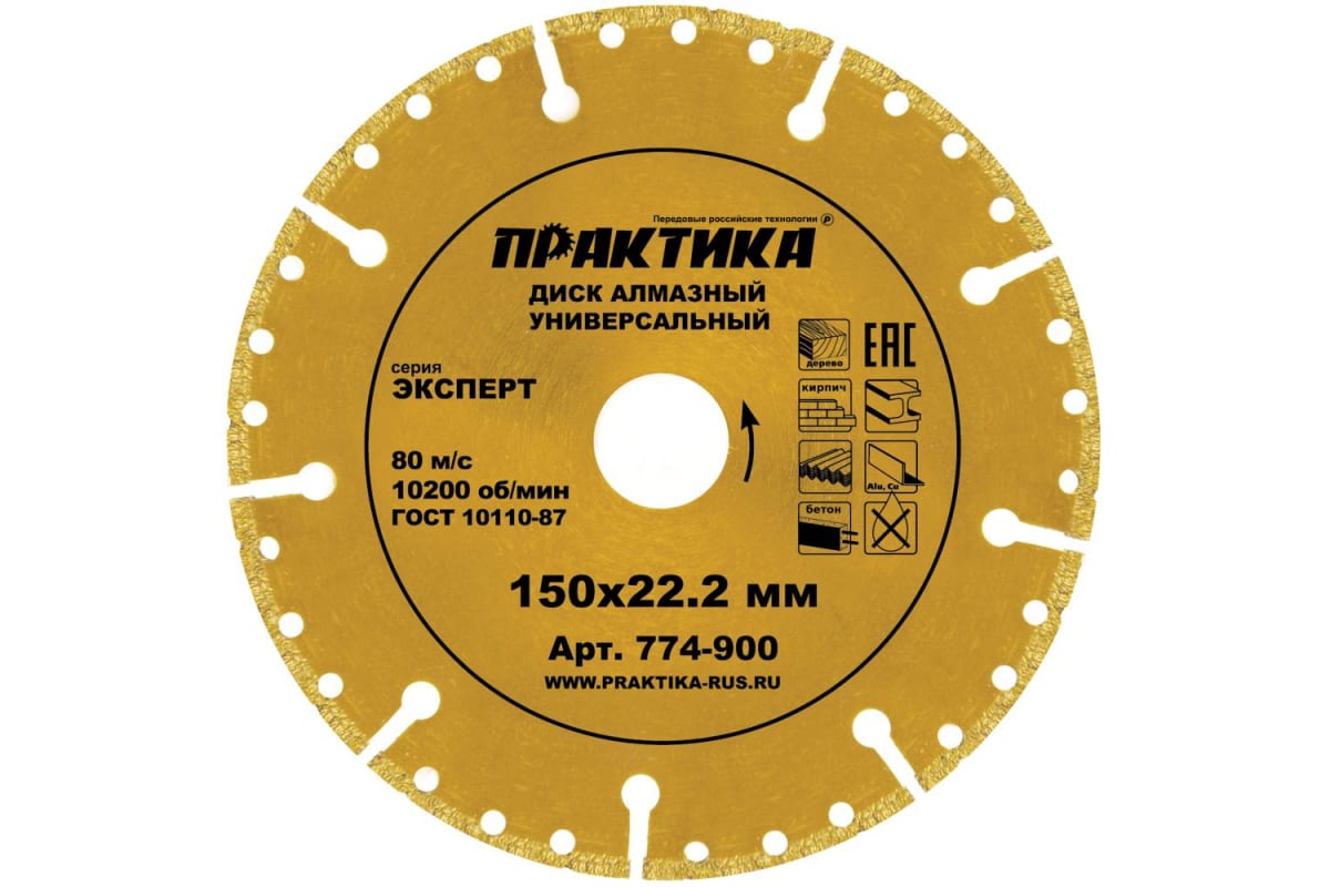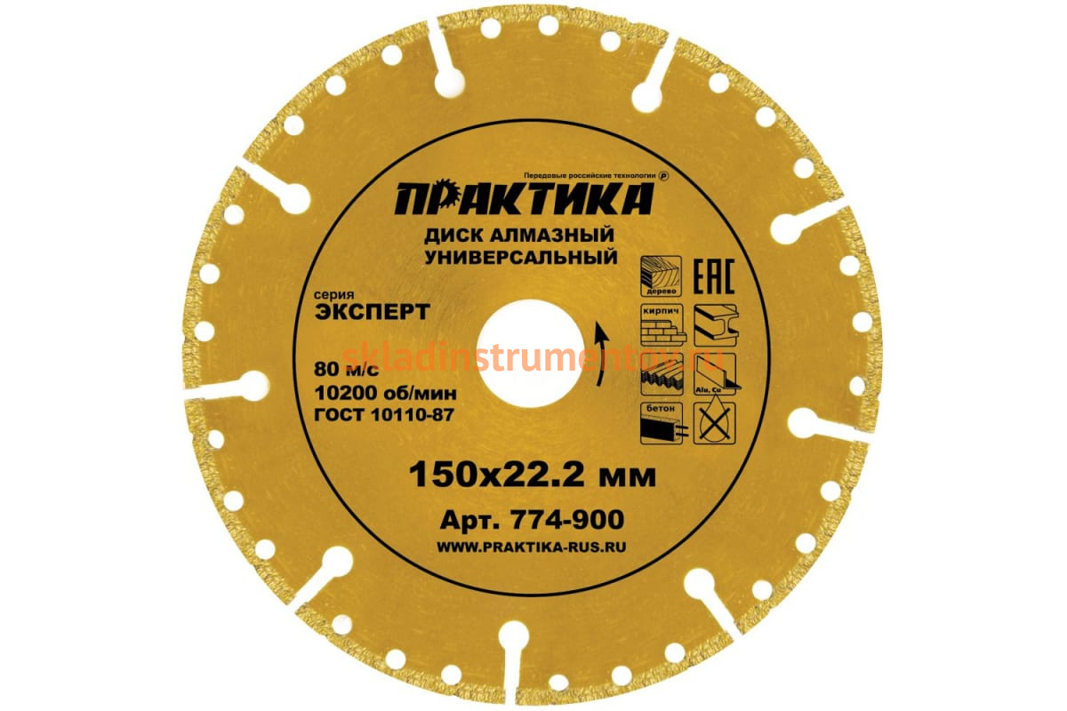 Диск алмазный сегментный Эксперт-Универсал (150х22.2 мм) ПРАКТИКА 774-900 предназначен для ручных резчиков. Применяется для сухой резки любых материалов от абразивных (асфальт, силикатный кирпич) до металлических профилей и дерева.