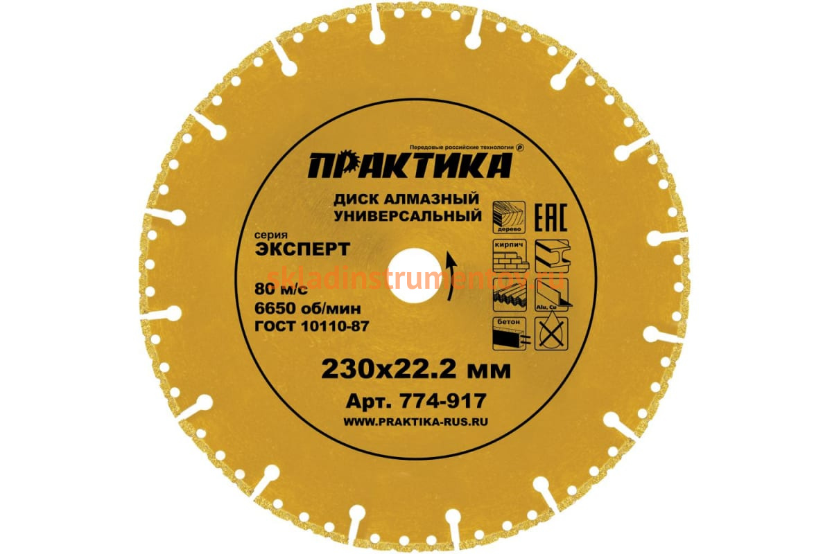 Диск алмазный сегментный Эксперт-Универсал (230х22.2 мм) ПРАКТИКА 774-917 предназначен для ручных резчиков. Применяется для сухой резки любых материалов от абразивных (асфальт, силикатный кирпич) до металлических профилей и дерева.