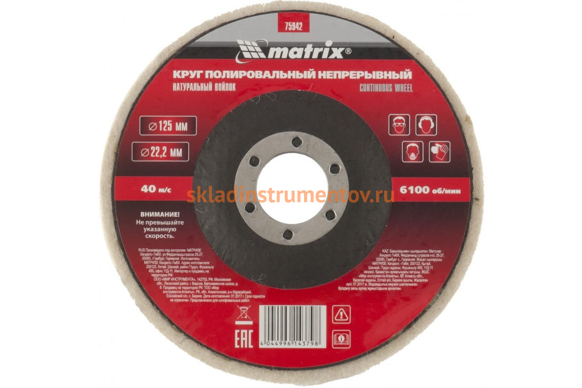 Круг полировальный непрерывный из натурального войлока 125х22,2 мм MATRIX 75942 используется для полировки плоских металлических поверхностей с помощью УШМ.