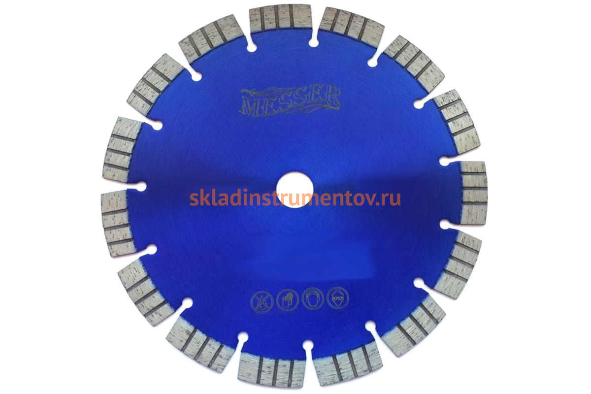 Диск алмазный турбосегментный FB/ZZ 230D-2.4T-15W-15S-22.2 MESSER 01-16-232 предназначен для резки бетона, железобетона, кирпича, тротуарной плитки, гранита, керамогранита, асфальта, свежего бетона.