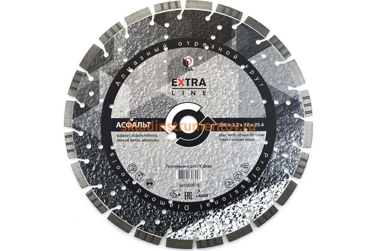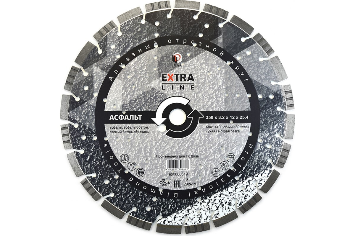 Диск алмазный сегментный Асфальт Extra Line Diam 000619 предназначен для резчиков швов, бензорезов, камнерезных станков. Применяется для сухого и мокрого реза асфальта, асфальтобетона, пенобетона, абразивного песчаника, шамотного и силикатного кирпича. Сухой рез позволяет работать диском без водяного охлаждения, что важно, например, для работ при минусовых температурах. Диск изготовлен с применением лазерной сварки сегментов к корпусу, что обеспечивает прочное соединение и практически исключает отрыв сегмента в процессе работы. Корпус диска изготовлен из специальной закаленной стали, что обеспечивает большую прочность, твердость и устойчивость к нагрузкам и перегреву.