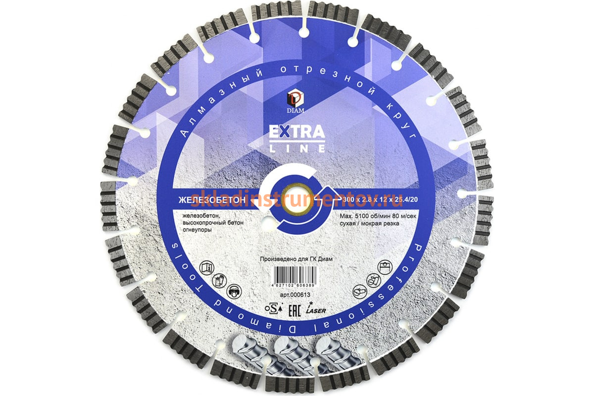 Диск алмазный сегментный Железобетон Extra Line Diam 000613 предназначен для резчиков швов, бензорезов, камнерезных станков. Применяется для сухого и мокрого реза железобетона, старого высокопрочного бетона и других твердых материалов. Сухой рез позволяет работать диском без водяного охлаждения, что важно, например, для работ при минусовых температурах. Диск изготовлен с применением лазерной сварки сегментов к корпусу, что обеспечивает прочное соединение и практически исключает отрыв сегмента в процессе работы. Корпус диска изготовлен из специальной закаленной стали, что обеспечивает большую прочность, твердость и устойчивость к нагрузкам и перегреву.