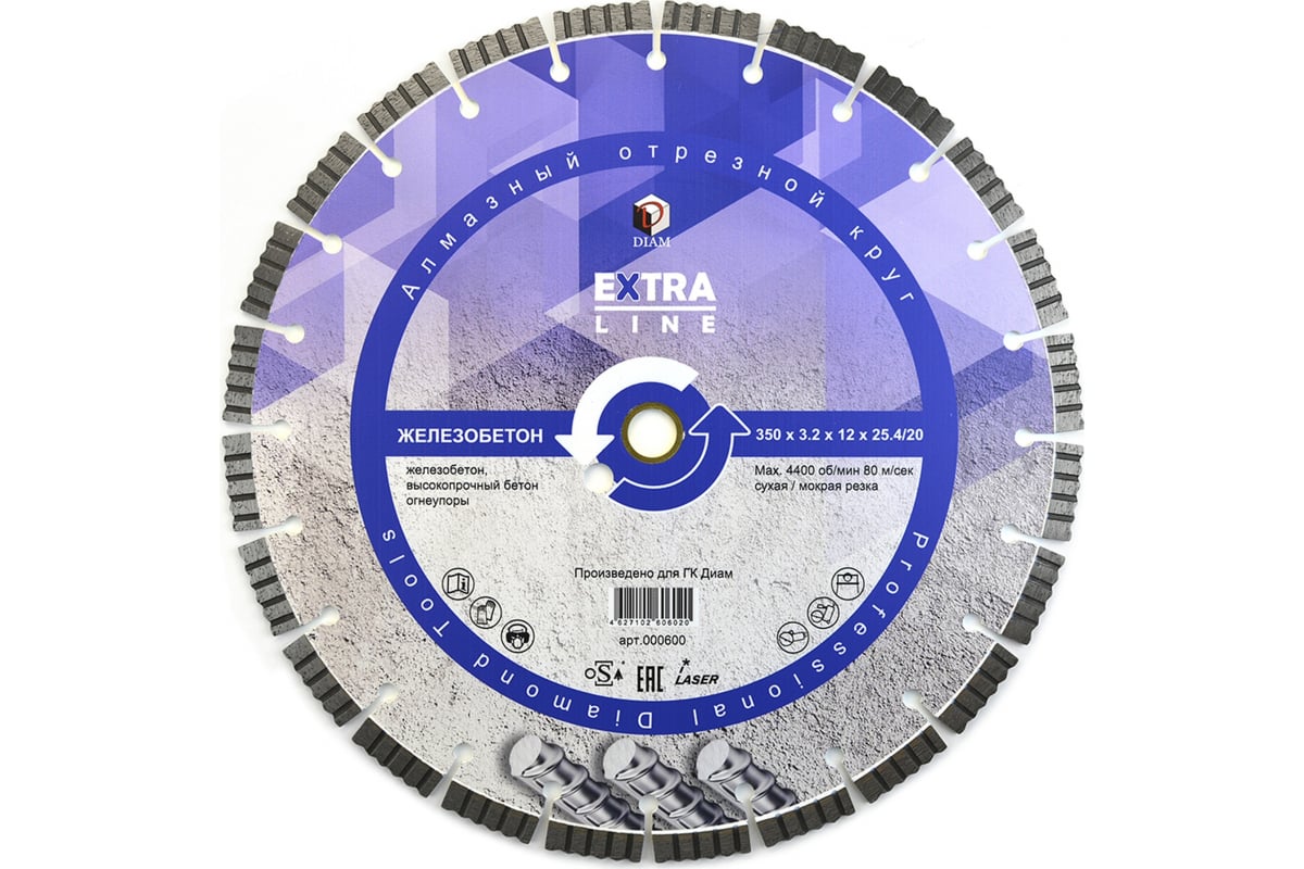 Диск алмазный сегментный Железобетон Extra Line Diam 000600 предназначен для резчиков швов, бензорезов, камнерезных станков. Применяется для сухого и мокрого реза железобетона, старого высокопрочного бетона и других твердых материалов. Сухой рез позволяет работать диском без водяного охлаждения, что важно, например, для работ при минусовых температурах. Диск изготовлен с применением лазерной сварки сегментов к корпусу, что обеспечивает прочное соединение и практически исключает отрыв сегмента в процессе работы. Корпус диска изготовлен из специальной закаленной стали, что обеспечивает большую прочность, твердость и устойчивость к нагрузкам и перегреву.