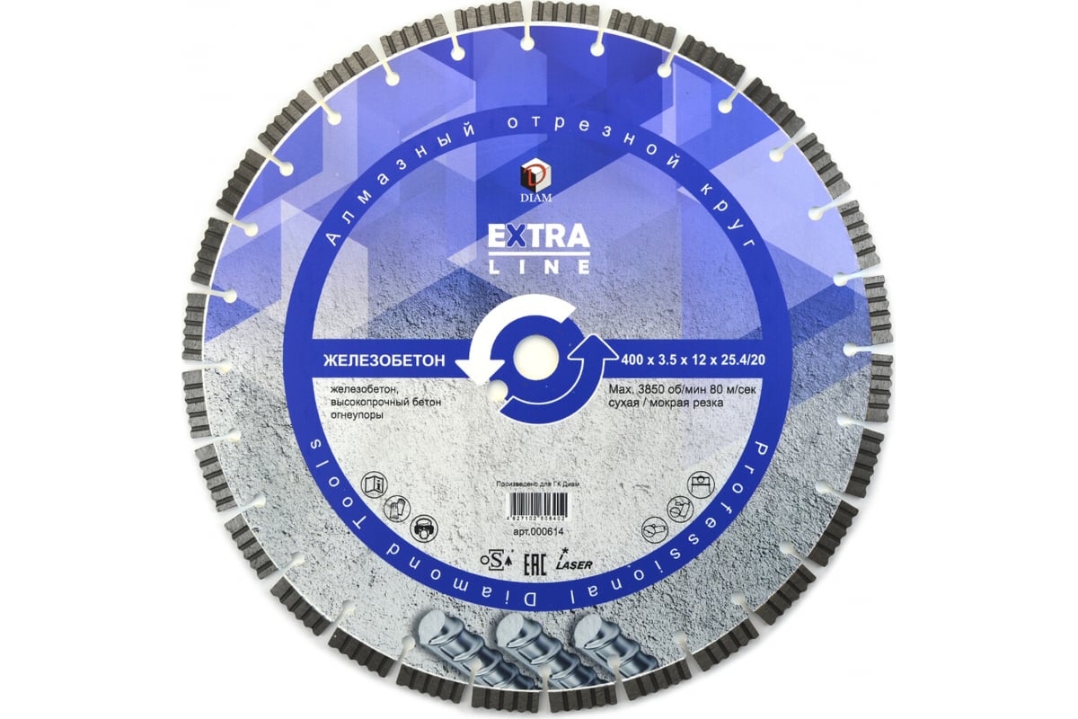 Диск алмазный сегментный Железобетон Extra Line Diam 000614 предназначен для резчиков швов, бензорезов, камнерезных станков. Применяется для сухого и мокрого реза железобетона, старого высокопрочного бетона и других твердых материалов. Сухой рез позволяет работать диском без водяного охлаждения, что важно, например, для работ при минусовых температурах. Диск изготовлен с применением лазерной сварки сегментов к корпусу, что обеспечивает прочное соединение и практически исключает отрыв сегмента в процессе работы. Корпус диска изготовлен из специальной закаленной стали, что обеспечивает большую прочность, твердость и устойчивость к нагрузкам и перегреву.
