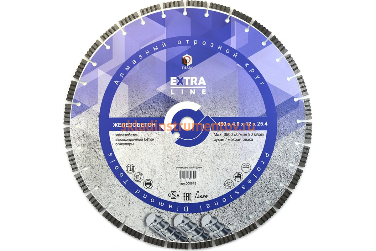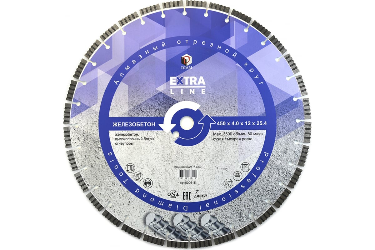 Диск алмазный сегментный Железобетон Extra Line Diam 000615 предназначен для резчиков швов, бензорезов, камнерезных станков. Применяется для сухого и мокрого реза железобетона, старого высокопрочного бетона и других твердых материалов. Сухой рез позволяет работать диском без водяного охлаждения, что важно, например, для работ при минусовых температурах. Диск изготовлен с применением лазерной сварки сегментов к корпусу, что обеспечивает прочное соединение и практически исключает отрыв сегмента в процессе работы. Корпус диска изготовлен из специальной закаленной стали, что обеспечивает большую прочность, твердость и устойчивость к нагрузкам и перегреву.