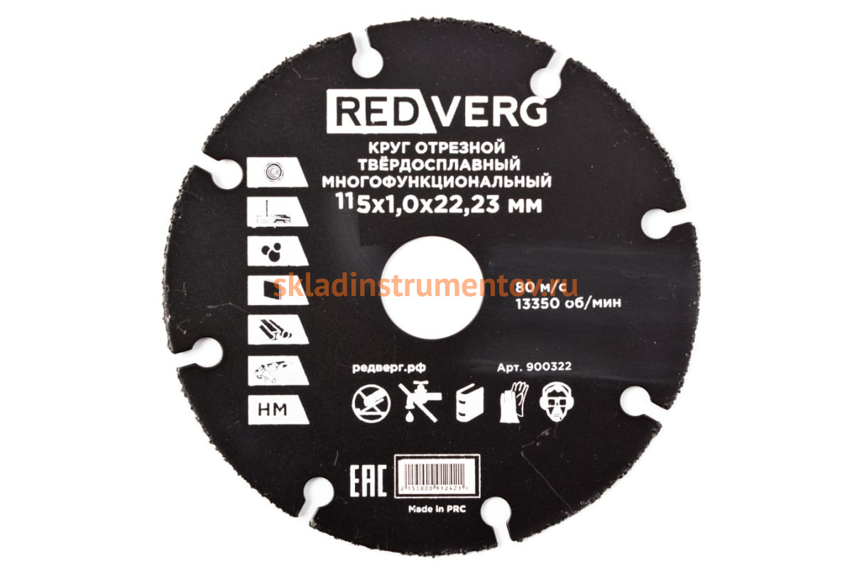 Круг отрезной многофункциональный REDVERG 900322 6627123 предназначен для резки древесины, древесины с гвоздями, пластика, гипсокартона, меди с помощью угловой шлифовальной машины. Имеет твердосплавное зернистое покрытие.