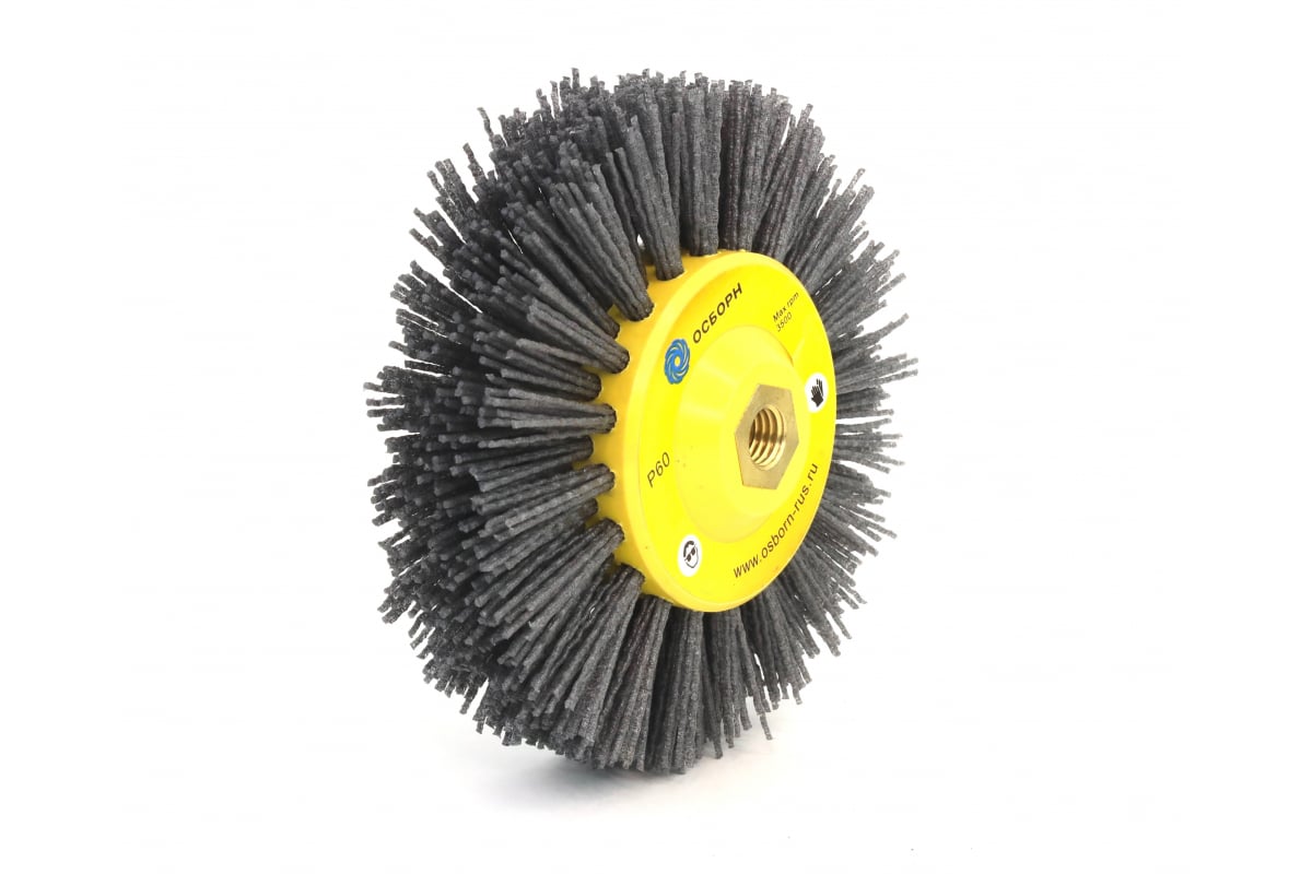 Щетка дисковая (150х40 мм; M14; ворс полимер абразив P60) ОСБОРН 6-011 PLM.DB150M14P60 для обработки дерева, браширования, текстурирования и шлифовки. Идеальна для обработки горизонтальных поверхностей из древесины, например мебели, полов, перил и т.п.