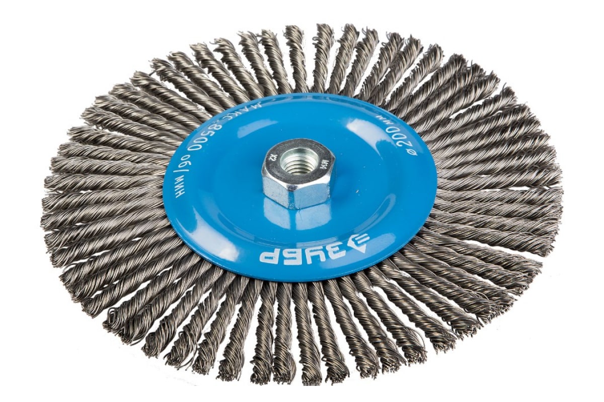 Щетка ЭКСПЕРТ дисковая для УШМ (жгутированная проволока 0,5 мм, 200 мм, М14) Зубр 35192-200_z01 используется для удаления старого ЛКП, зачистки от ржавчины и окалины металлических поверхностей.