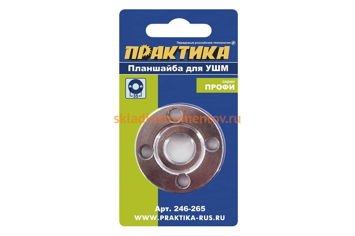 Планшайба ПРАКТИКА 246-265 предназначена для угловых шлифовальных машин. Применяется для установки дисков с посадкой 22.2 мм. Фиксация гайки производится при помощи штырькового ключа. Расстояние между отверстиями – 35 мм. Резьба гайки – М14.