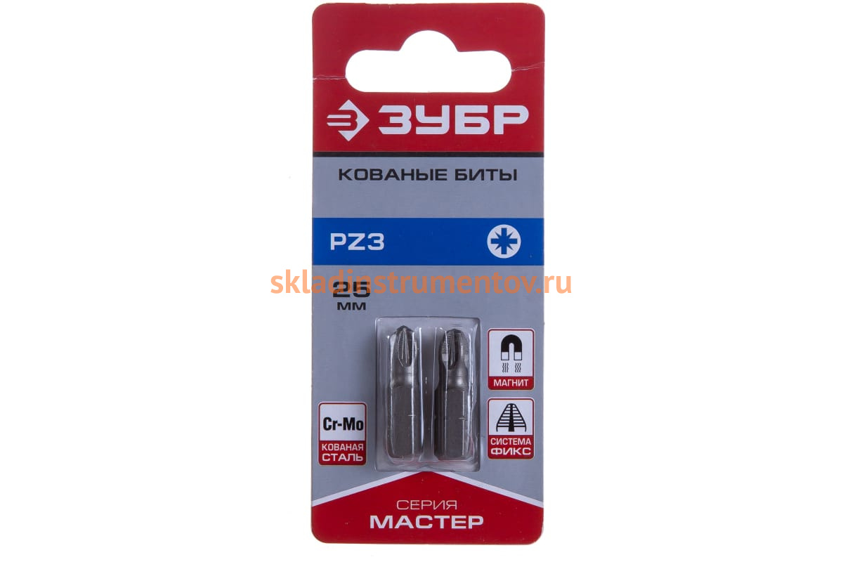 Биты "МАСТЕР" Зубр 26003-3-25-2 являются расходным инструментом для шуруповертов при монтаже/демонтаже крепежа со шлицем PZ3. Система насечек "ФИКС" обеспечивает максимально точную посадку шлица в крепеже. Биты изготовлены из кованой хромомолибденовой стали, что обеспечивает им продолжительный срок службы. Также стоит отметить, что шлиц намагничен, что делает рабочий процесс комфортнее. Длина бит составляет 25 мм, тип хвостовика - С 1/4".