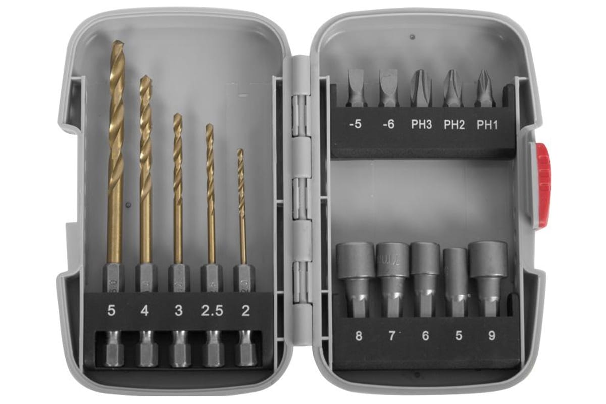 Набор насадок Зубр 26055-H15 используется совместно с шуроповертами и дрелями. Оснастка предназначена для выполнения различных задач. Сверла изготовлены из быстрорежущей стали, очень прочные и долговечные. Биты имеют шестигранный хвостовик и произведены из хромованадиевой стали высокого качества, а их поверхность обладает специальным защитным покрытием. Все это обеспечивает долгий срок службы оснастки, ее высокую прочность и защиту от химических воздействий. Торсионная зона бит предохраняет наконечник от разрушений при пиковых нагрузках, а специальная система насечек предотвращает выскальзывание шлица из крепежа. Намагниченный шлиц повышает удобство работы. Торцовые головки также изготовлены из хромованадиевой стали.