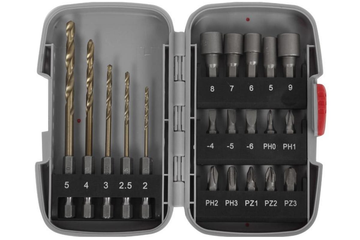 Набор насадок Зубр 26055-H20 используется совместно с шуроповертами и дрелями. Оснастка предназначена для выполнения различных задач. Сверла изготовлены из быстрорежущей стали, очень прочные и долговечные. Биты имеют шестигранный хвостовик и произведены из хромованадиевой стали высокого качества, а их поверхность обладает специальным защитным покрытием. Все это обеспечивает долгий срок службы оснастки, ее высокую прочность и защиту от химических воздействий. Торсионная зона бит предохраняет наконечник от разрушений при пиковых нагрузках, а специальная система насечек предотвращает выскальзывание шлица из крепежа. Намагниченный шлиц повышает удобство работы. Торцовые головки также изготовлены из хромованадиевой стали.