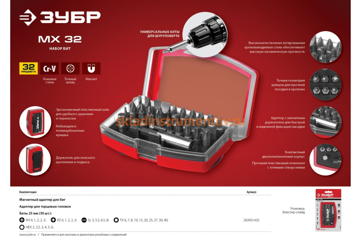Набор бит "МХ-32" Зубр 26393-H32 используется при монтаже/демонтаже различного крепежа: шурупов, саморезов, винтов, болтов. Набор поставляется в компактном боксе.