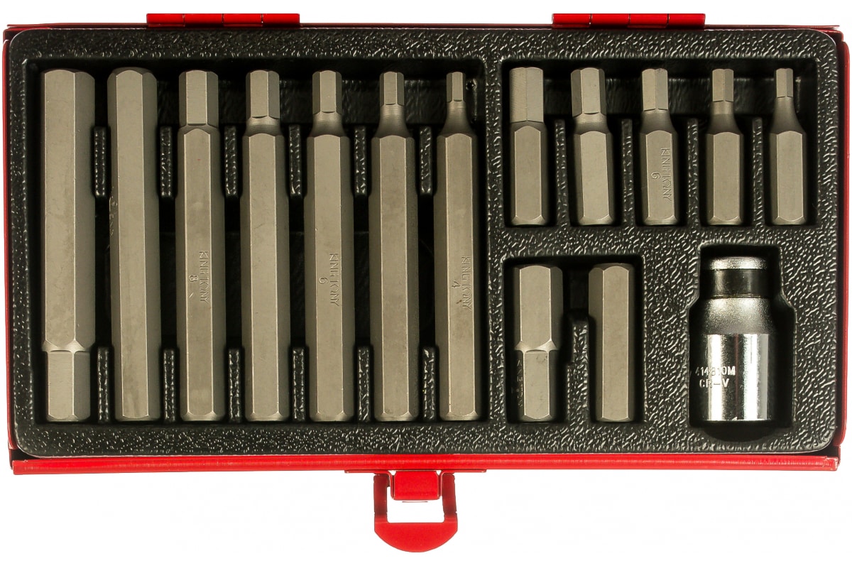 Набор вставок (бит) 10мм, HEX 4-12мм, 15шт KING TONY 1015MQ состоит из 15 предметов, имеющих внешний рабочий профиль различных размеров в виде шестигранников HEX. Принадлежности изготовлены из прочной и качественной стали, обладают высоким рабочим ресурсом, подходят для профессионального использования. Набор поставляется в металлическом кейсе с застежкой, что снижает риск утери компонентов при хранении и транспортировке.