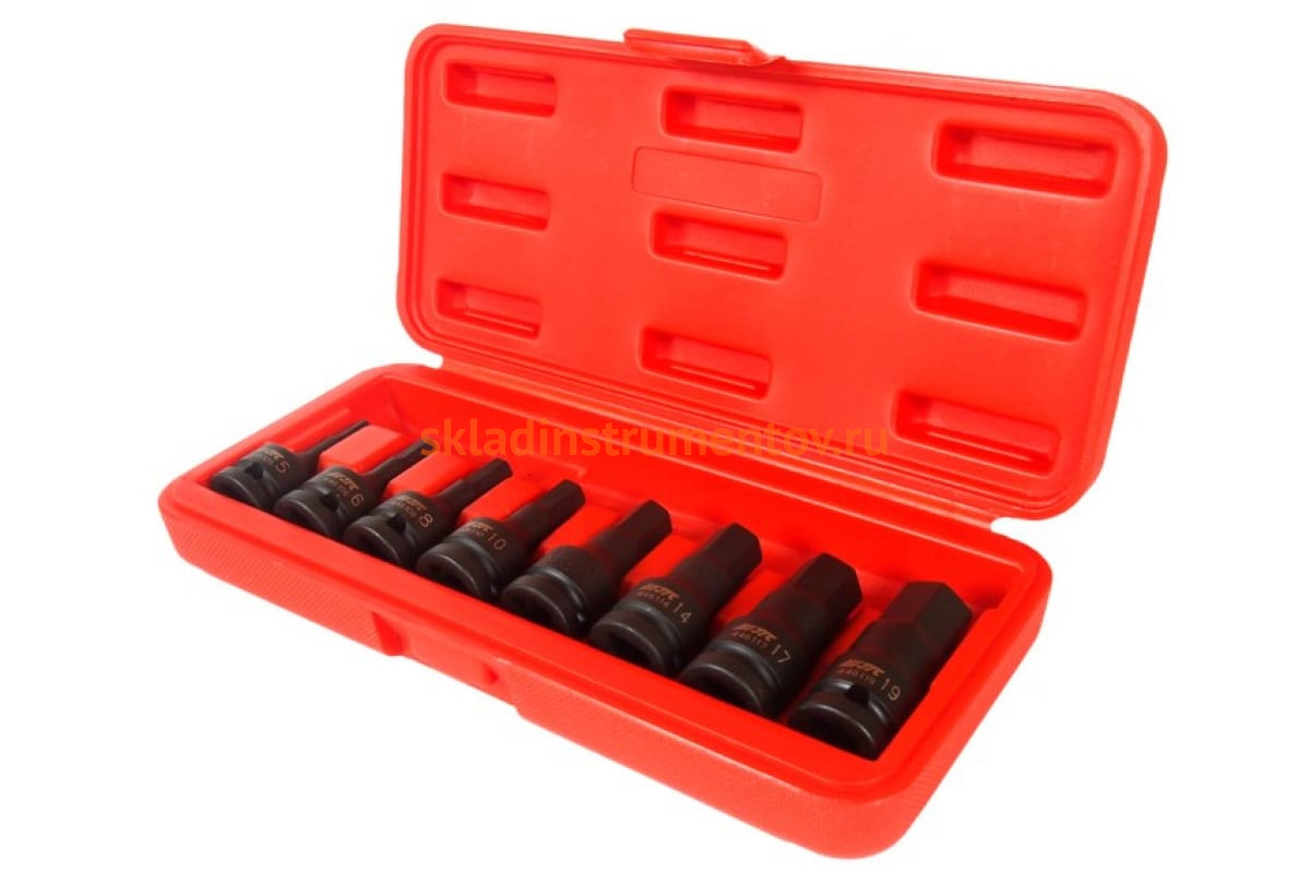Набор ударных бит-головок 1/2" HEX H5-19 мм, длина 60 мм, в кейсе (8 предметов) JTC J408H выполнен из стали SNCM 8660, что существенно увеличивает его срок службы. Оснастка поставляется в пластиковом кейсе, который способствует удобству ее хранения. В набор входят такие биты головки, как Н5, Н6, Н8, Н10, Н12, Н14, Н17 и Н19 длиной 60 мм.