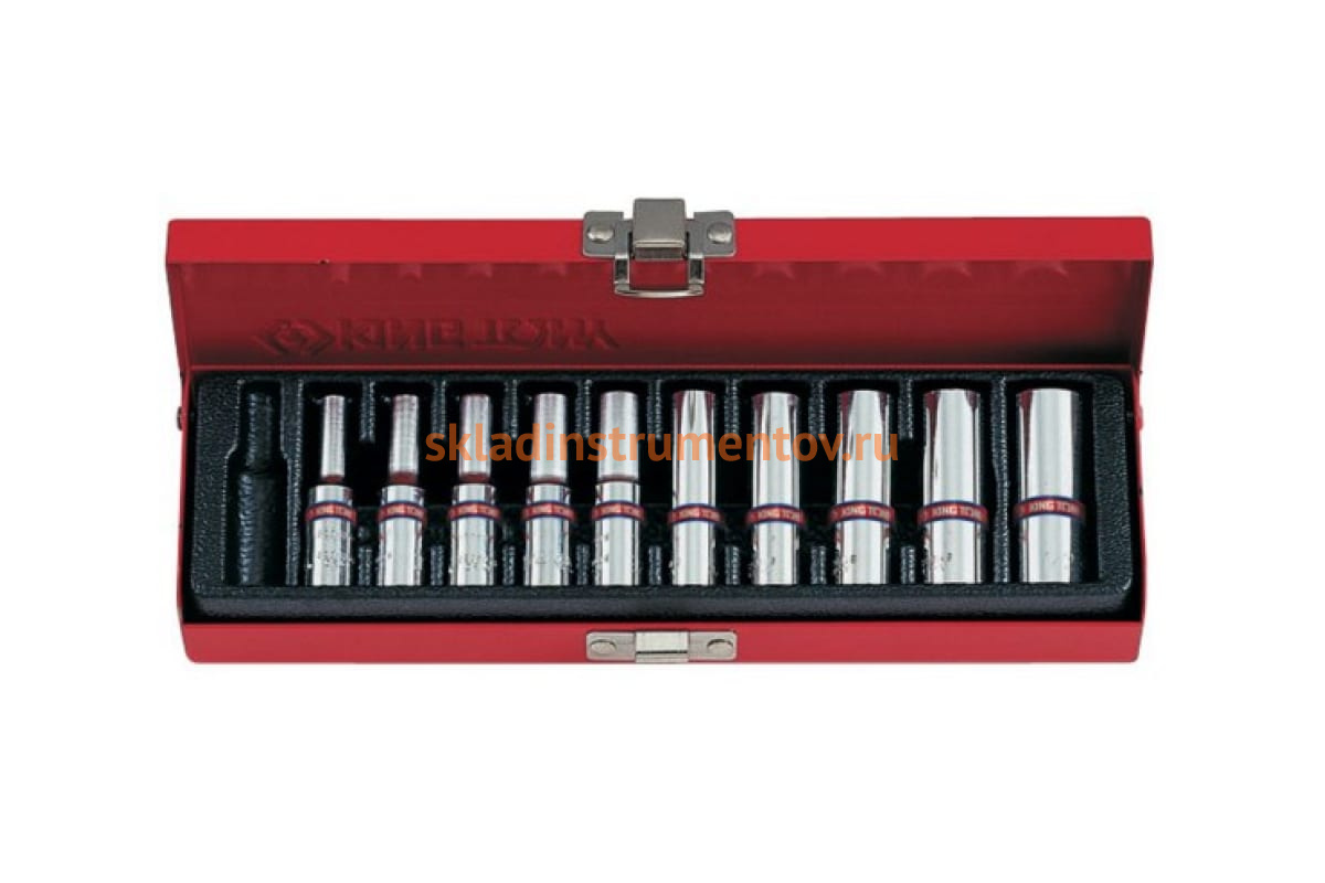 Набор глубоких торцевых головок (1/4", шестигранные, 5/32"-1/2", 10 предметов) KING TONY 2510SR используется в автосервисе для съема крепежных элементов размером от 4 до 12.7 мм. Прочная оснастка отличается эффективностью применения.