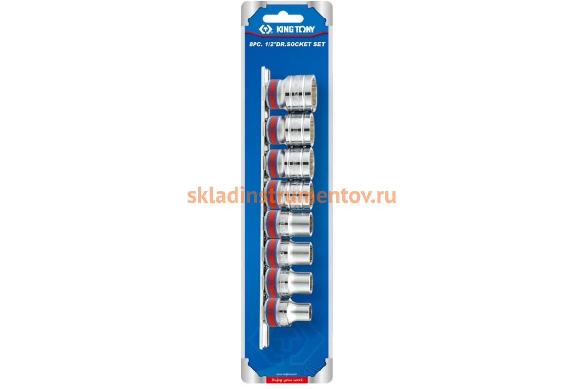 Набор торцевых головок (1/2", двенадцатигранные, 3/8"-7/8", 8 предметов) KING TONY 4010SR располагается на металлическом держателе для удобства хранения. Прочная и качественная оснастка используется совместно с ручным инструментом. Размер посадочного отверстия составляет 1/2 дюйма.