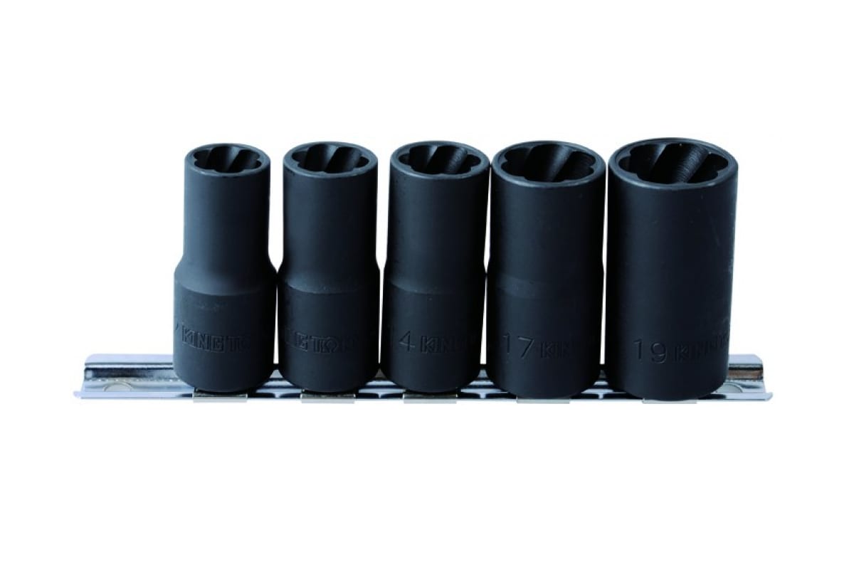 Набор торцевых головок для поврежденных гаек и болтов (12, 13, 14, 17 и 19 мм; 5 предметов) KING TONY 9TD035MR выполнен из прочного и современного материала - легированной стали SNCM с примесью молибдена. Специальная насечка делает быстрым и удобным извлечение ржавого и поврежденного крепежа. Не подходит для работы с ударным пневматическим пистолетом.