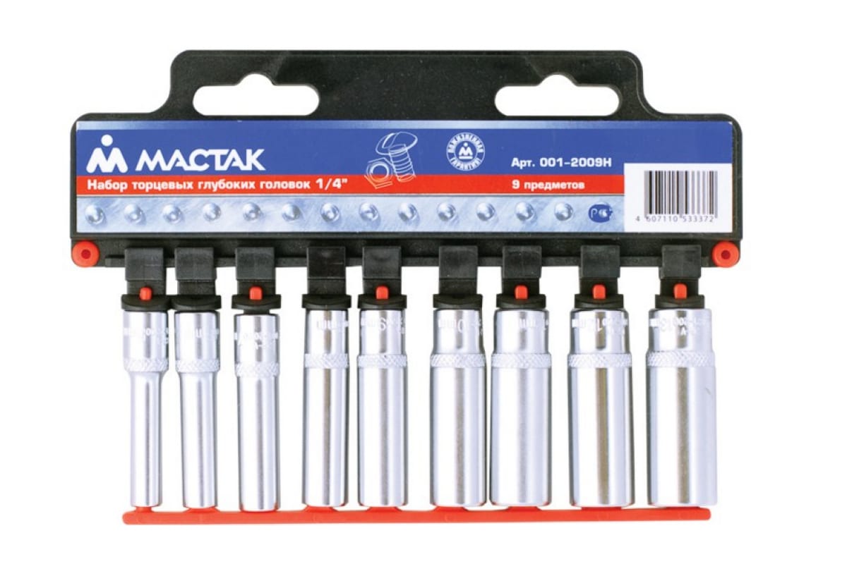 Набор торцевых глубоких головок (1/4", 5-13 мм, 9 предметов) МАСТАК 001-2009H используется для закручивания и откручивания крепежа в условиях сборочного цеха, автосервиса или частной слесарной мастерской. Профессиональная оснастка отличается высоким уровнем прочности и долгим сроком эксплуатации. Удобная система крепления на держателе исключает потерю головок при транспортировке.