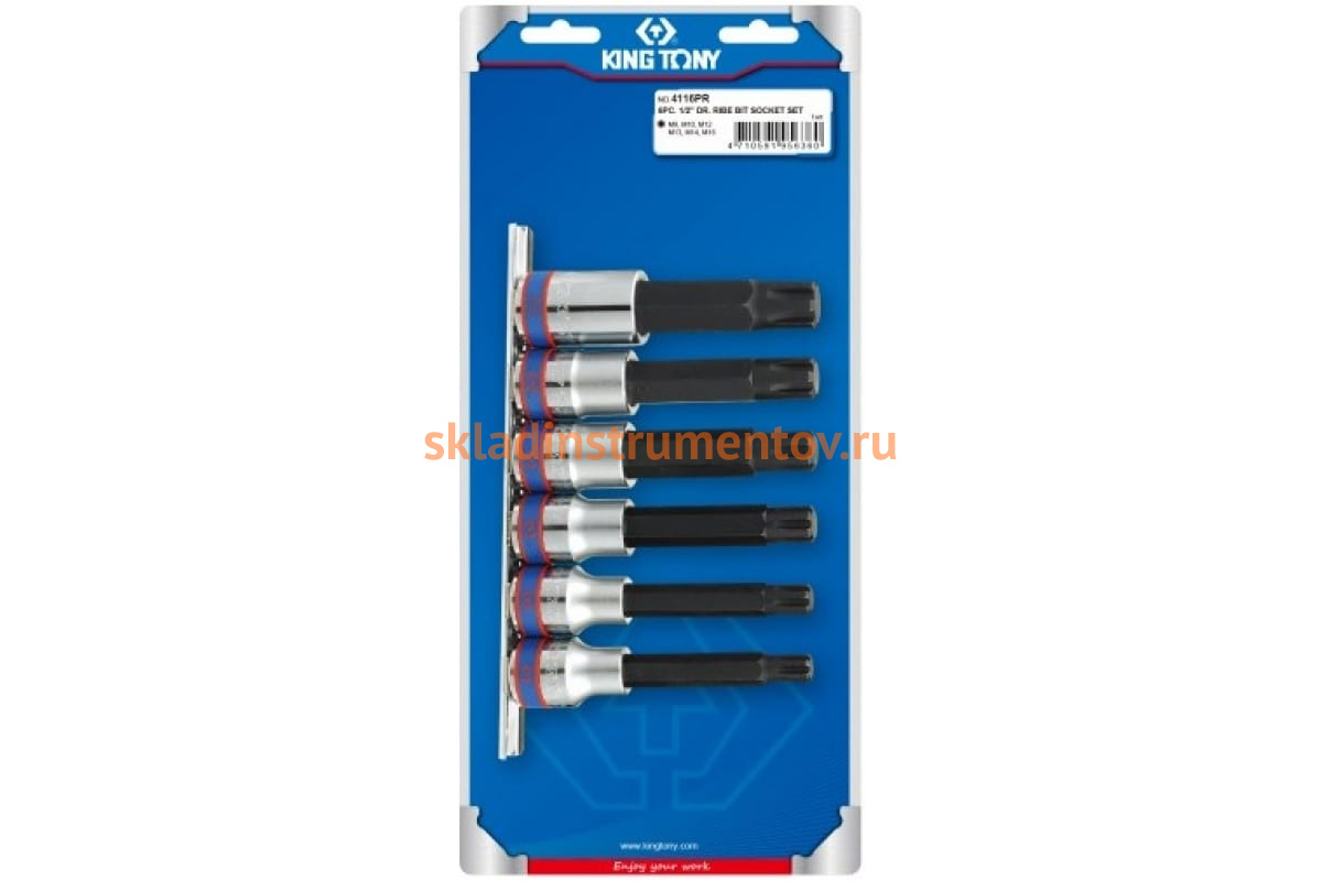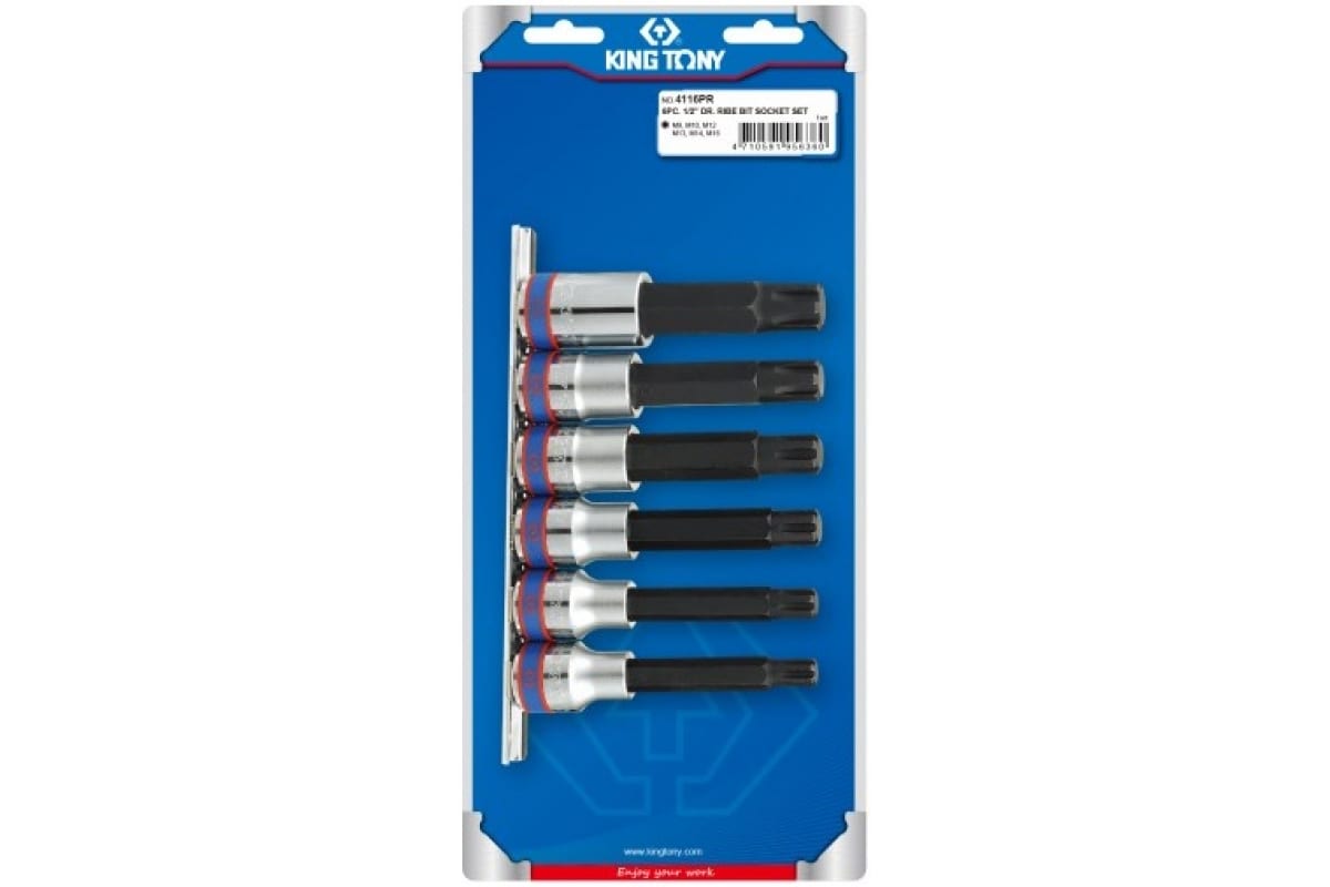 Набор торцевых насадок 1/2", RIBE М9-М16, 100мм, 6шт KING TONY 4116PR используется в качестве оснастки для инструментов с приводом 1/2" при необходимости выполнения крепежных операций с использованием винтов, имеющих внутренний рабочий профиль в виде специальной звездочки RIBE. В комплекте представлены самые распространенные размеры наконечников, которые могут пригодиться любому мастеру. Для удобства хранения и транспортировки головки расположены на специальном держателе.