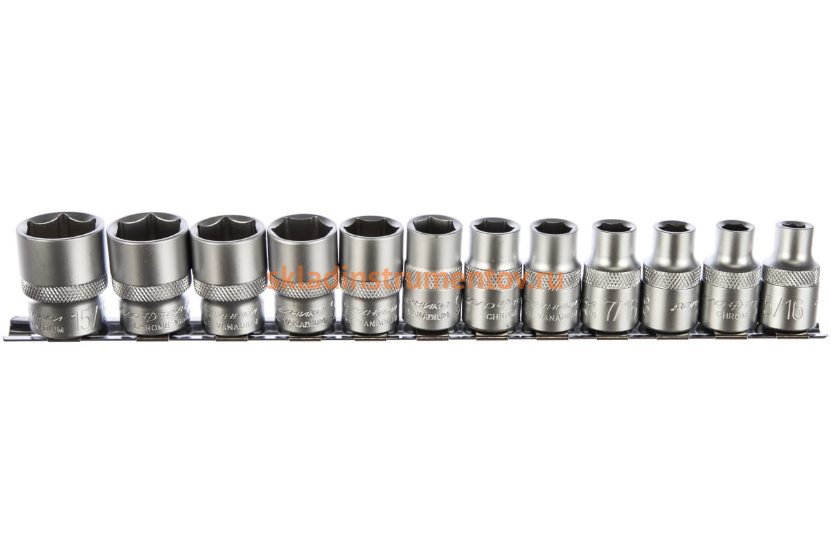 Набор состоит из 12 дюймовых торцевых головок: 5/16", 11/32", 3/8", 7/16", 15/32", 1/2", 9/16", 11/16", 3/4", 13/16", 7/8", 15/16".