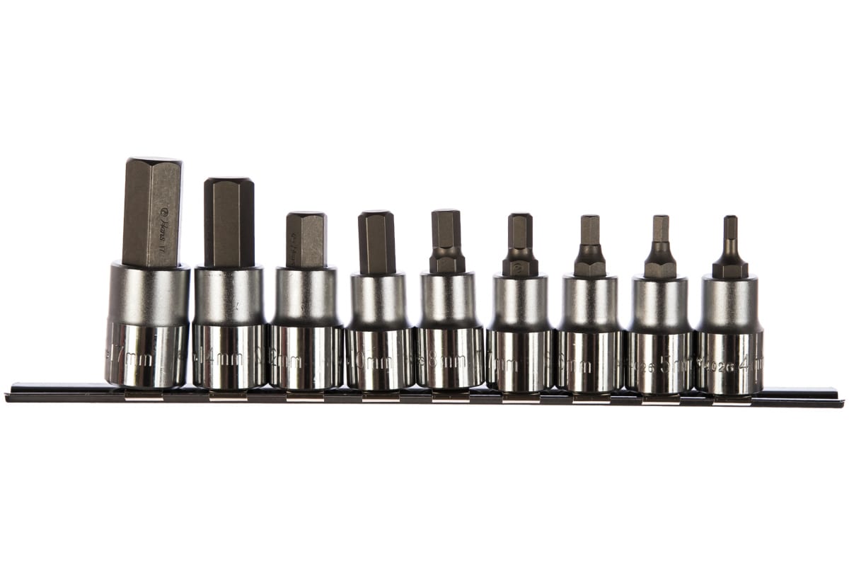 В наборе 9 торцевых головок-вставок НЕХ: 4, 5, 6, 7, 8, 10, 12, 14, 17 мм.