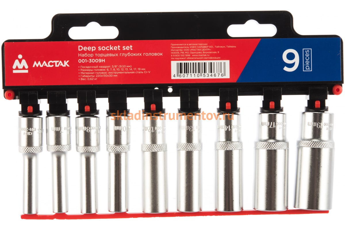 Набор торцевых головок 6-ти гранных МАСТАК 001-3009H используется при монтаже/демонтаже крепежных элементов, имеющих шестигранный профиль, с помощью ручного инструмента или гайковерта.