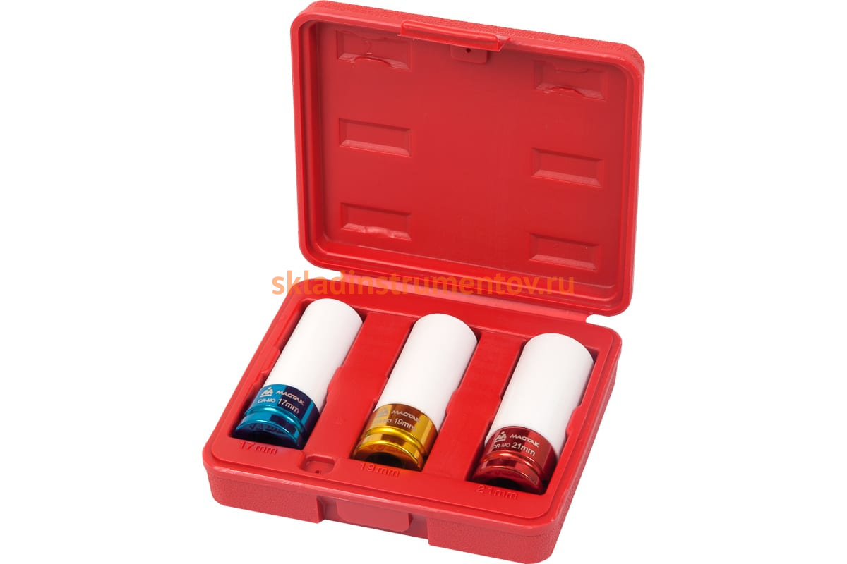 В комплект входят головки размером 17, 19 и 21 мм.