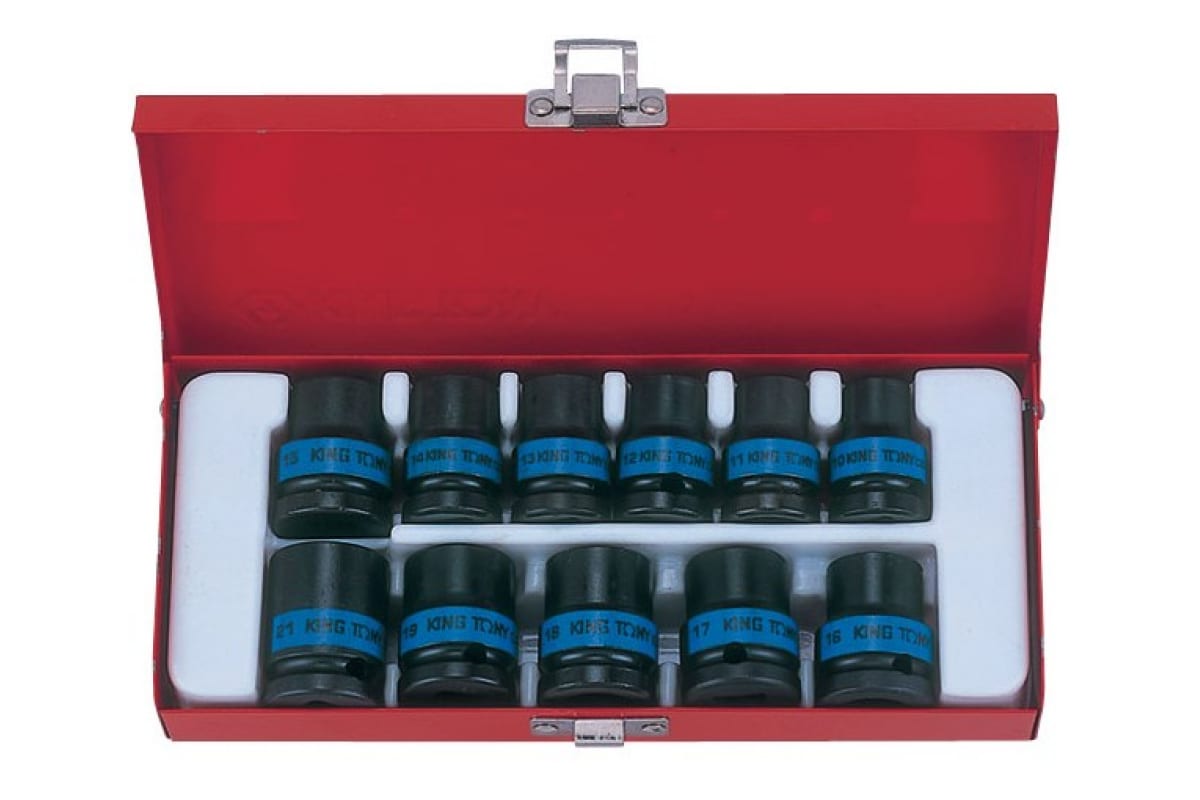 Набор ударных торцевых головок (1/2", шестигранные, 10-21 мм, 11 предметов) KING TONY 4412MP весит 1.613 кг. Специальная вставка в кейс не дает головкам смешиваться в процессе транспортировки. Набор используется в процессе обслуживания крепежных узлов.