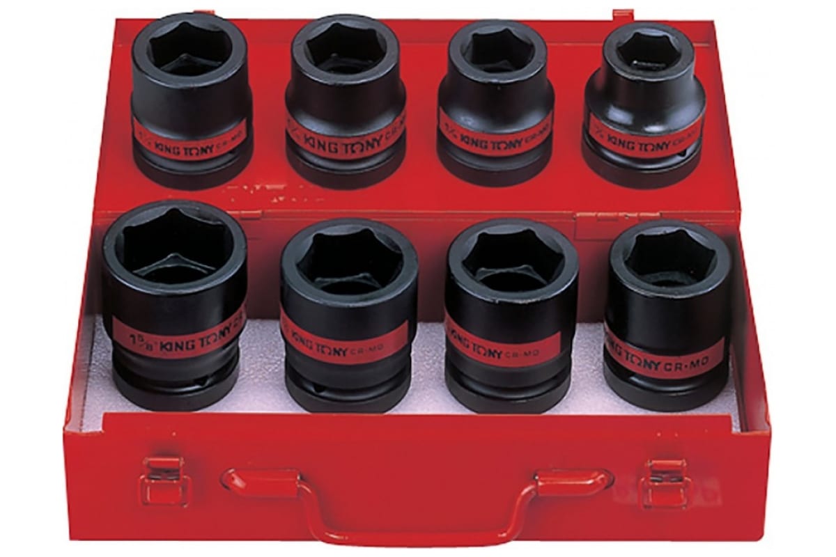 Набор ударных шестигранных торцевых головок 1", 15/16"-5/18", 8шт KING TONY 8410SP предназначается для профессионального использования в области слесарно-монтажных работ с применением инструмента ударного действия. Головки имеет дюймовое исполнение. Материалом для их изготовления служит высокопрочный сплав с добавлением молибдена. Изделия позволят любому мастеру легко и быстро справиться с откручиванием заржавевшего или прикипевшего крепежа.