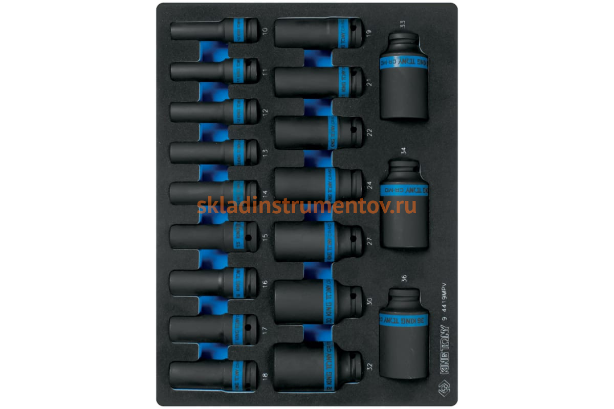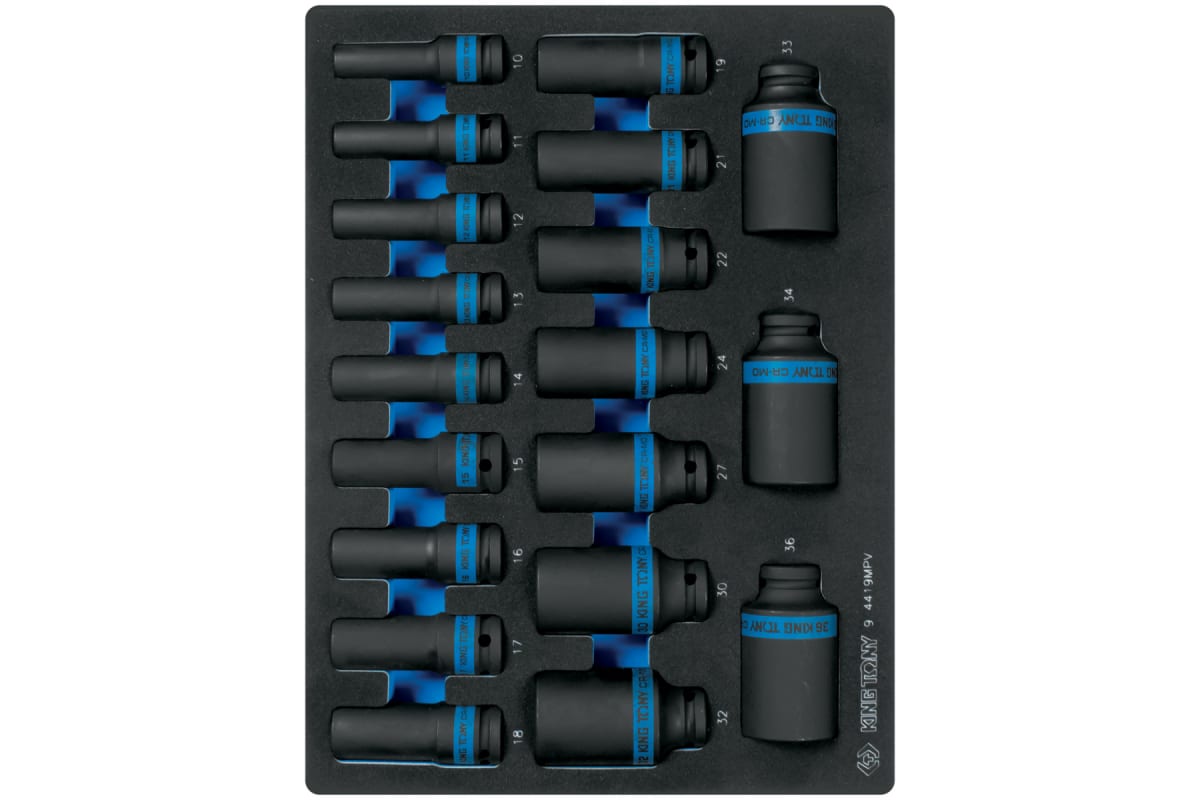 —Набор ударных глубоких торцевых головок 1/2", шестигранные, 10-36 мм, ложемент, 19 шт. KING TONY 9-4419MPV—